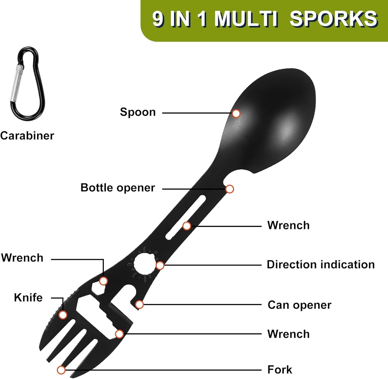 Multi-functional Camping Sporks – Made of stainless steel, it can be a spoon, fork, bottle opener, can opener, or positioning wrench which will add more functions to your camping travel and feature a hole to attach it to a backpack with a keychain for portability