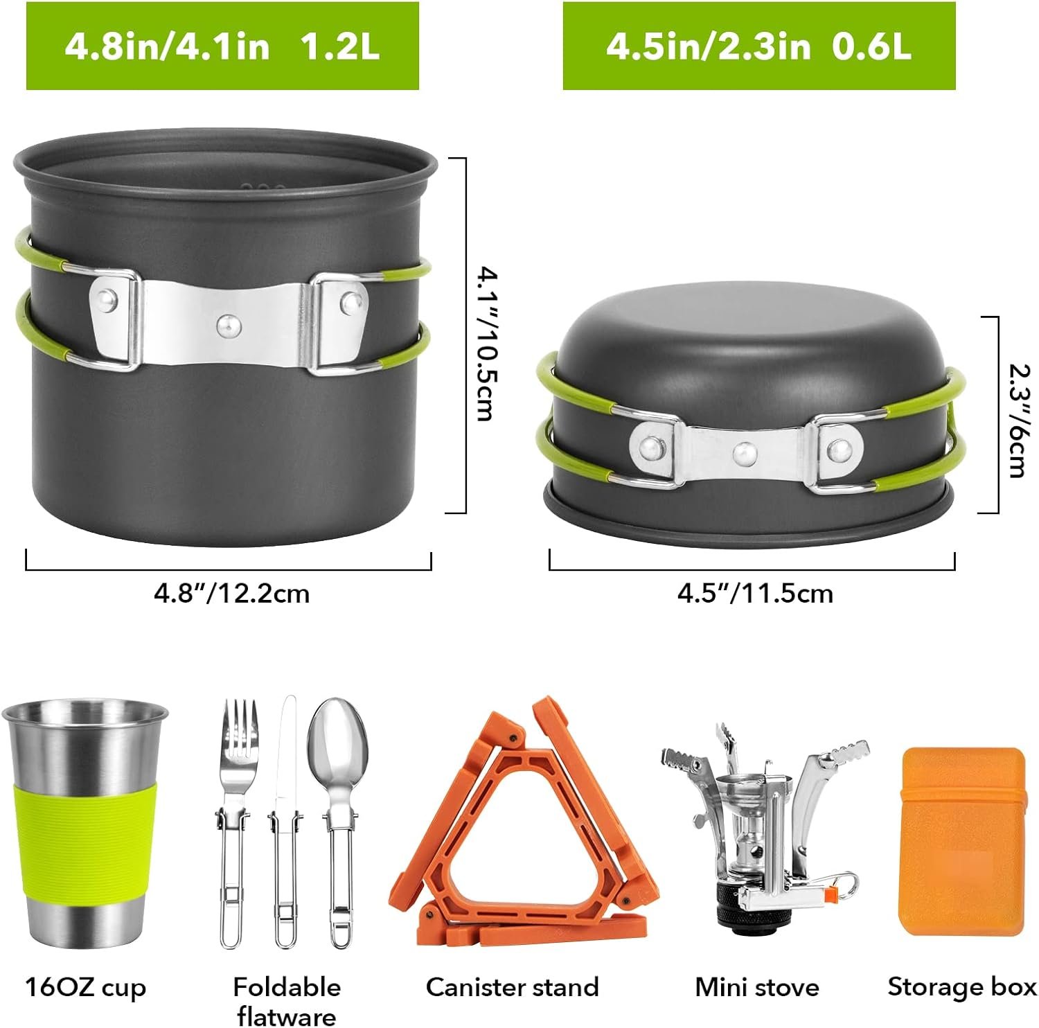 Cost Performance:Ryrueyal 10 pieces camping cooking set includes 1 aluminum non-stick pots(4.7*4.2in)+1 aluminum non-stick pots(4.5*2.4in)+1 camping stove+1 storage box+stainless steel folding fork/spoon/knife+tableware storage bag+tank bracket+1 stainless steel cup(16oz)+1mesh bag.