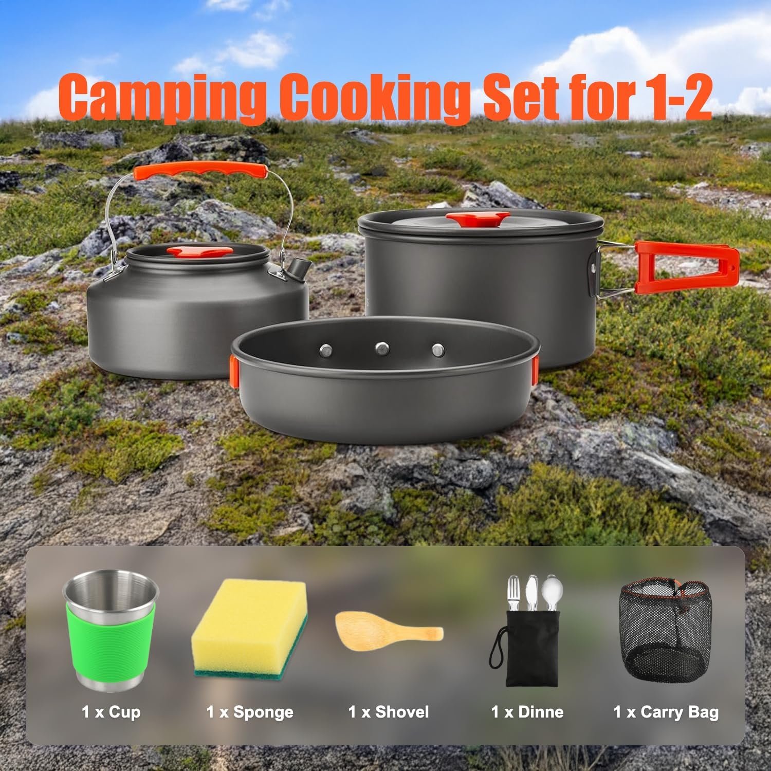 Premium Camping Cookware Set for 1-2 Person: Our lightweight camping cooking set features a 35oz nonstick pot and 59oz frying pan – perfect size for backpacking couples or solo hikers. The complete outdoor cookware kit includes pot, pan, 2 BPA-free bowls, folding sporks, cleaning sponge, and carry bag