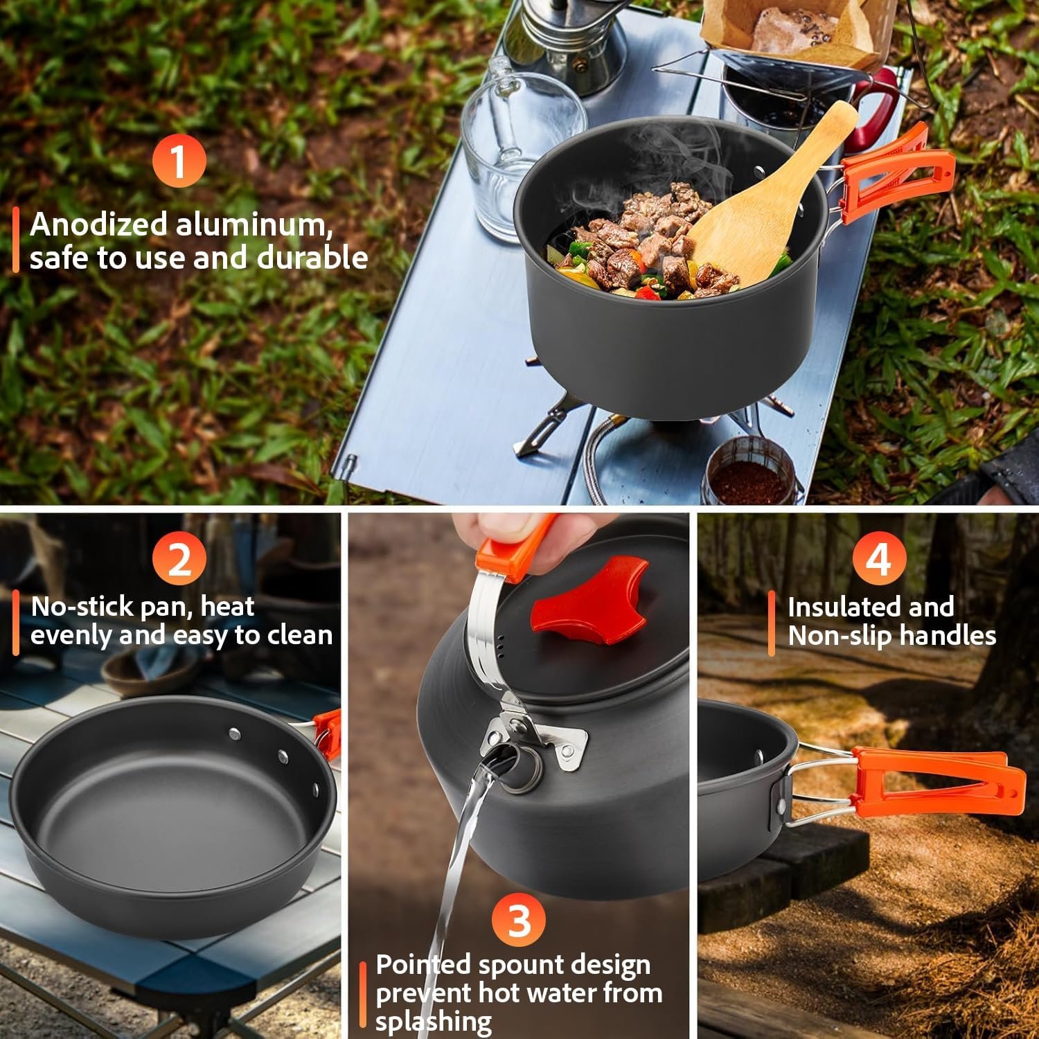 Advanced Non-stick Technology: The camping pots and pans feature our exclusive QuickClean coating, making cleanup 3x faster than traditional camp cookware. The non-stick surface requires minimal oil for healthy cooking and prevents food from sticking – perfect for backpacking meals and outdoor cooking