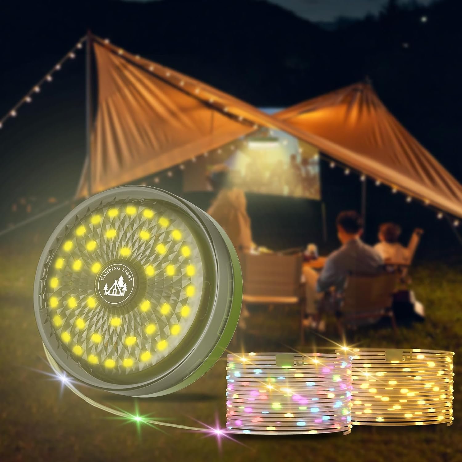 【Waterproof, Drop-proof, Rechargeable and Long-lasting】 The built-in 4000mAh rechargeable battery charges via USB-C in about 5 hours (charging cable included) and provides above 10 hours of use depending on the selected mode. The body of this camping lantern string lights is made of durable ABS material, Copper wire and construct with soft PVC rubber, It is highly flexible, resistant to tangling, and can be easily bent. Camping string lights waterproof with IP44 waterproof.