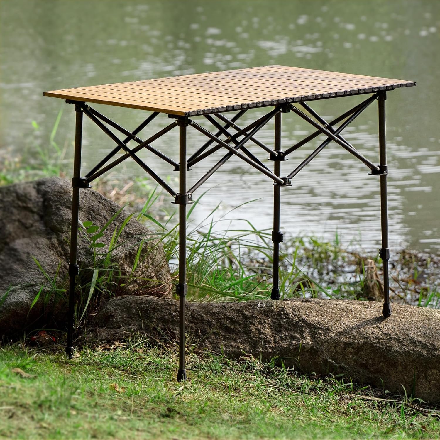 STABLE STRUCTURE: The legs of the foldable camping table unfold and lock with a crossbar buckle, creating multiple triangles for stability. The tabletop’s underside has a latch and the edges feature hinges, reducing displacement and increasing safety