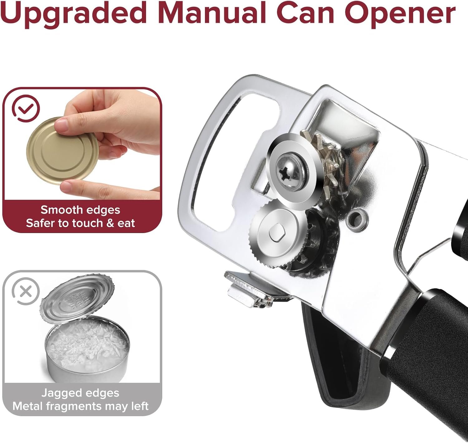 Smooth Cutting Process: Our manual can opener features unique cutting mechanism, sharp stainless steel blade perfectly aligned with precise gears, open cans smoothly, no metal fragments left