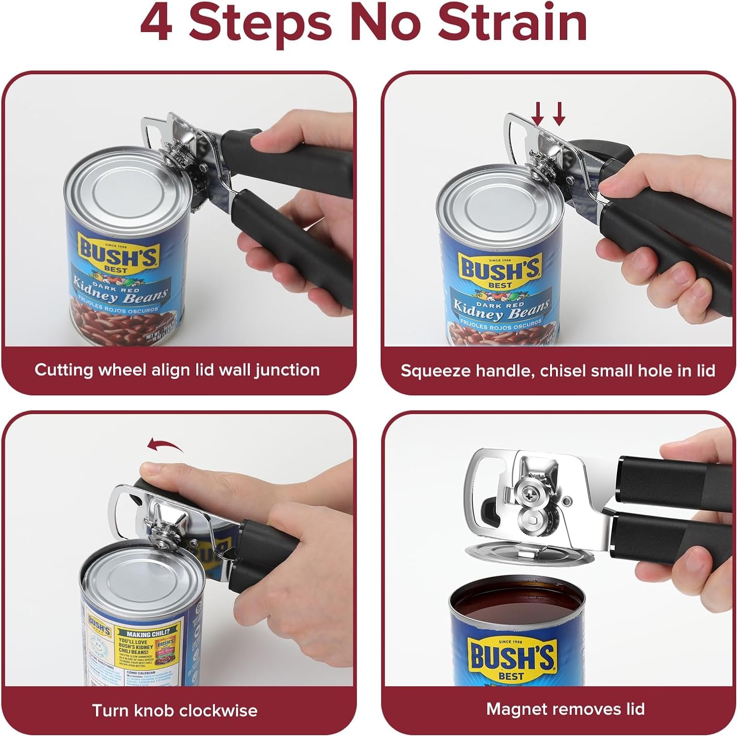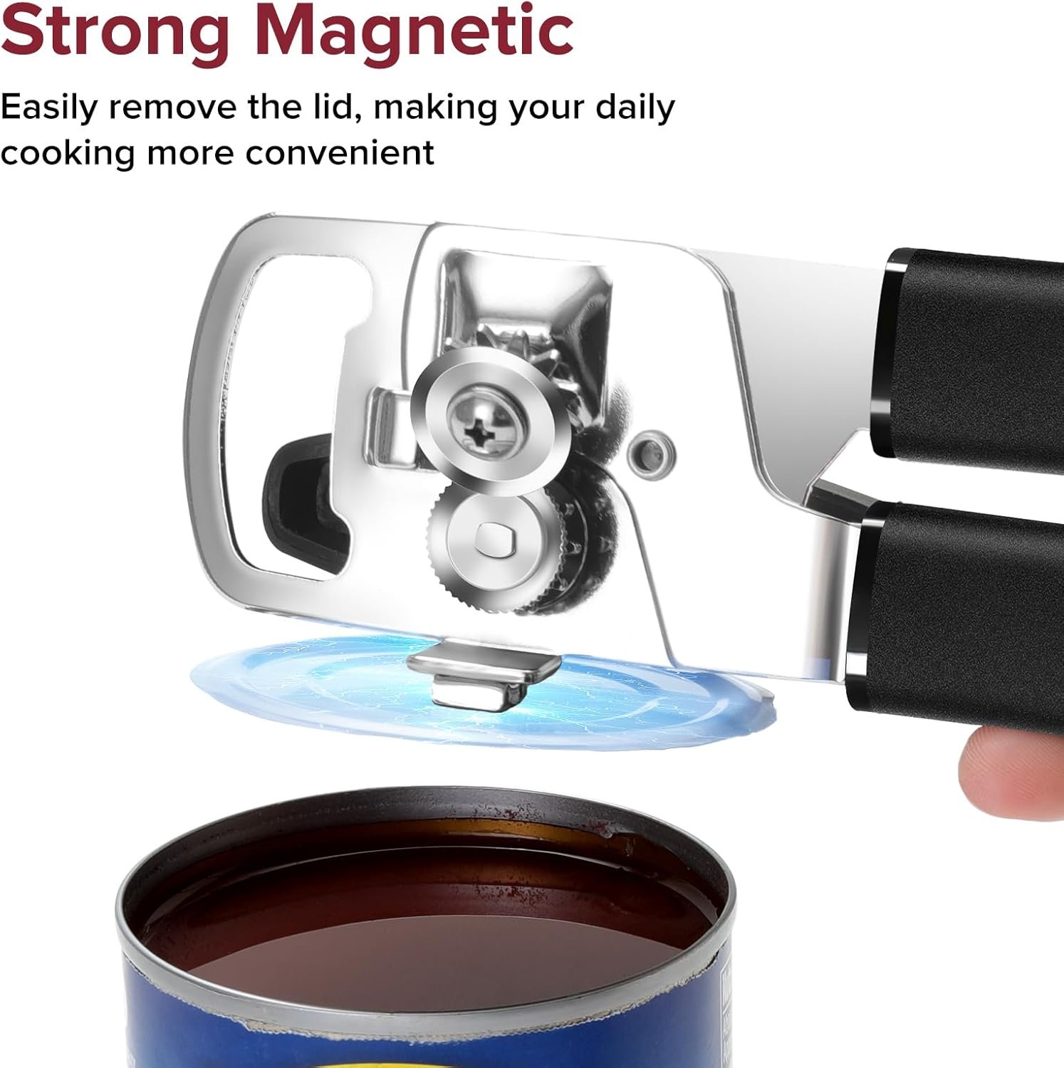 Magnet Lid Remover: The hand can opener has a strong magnet with fluted base reinforcement, after cutting completed, just a simple suction to remove the lid
