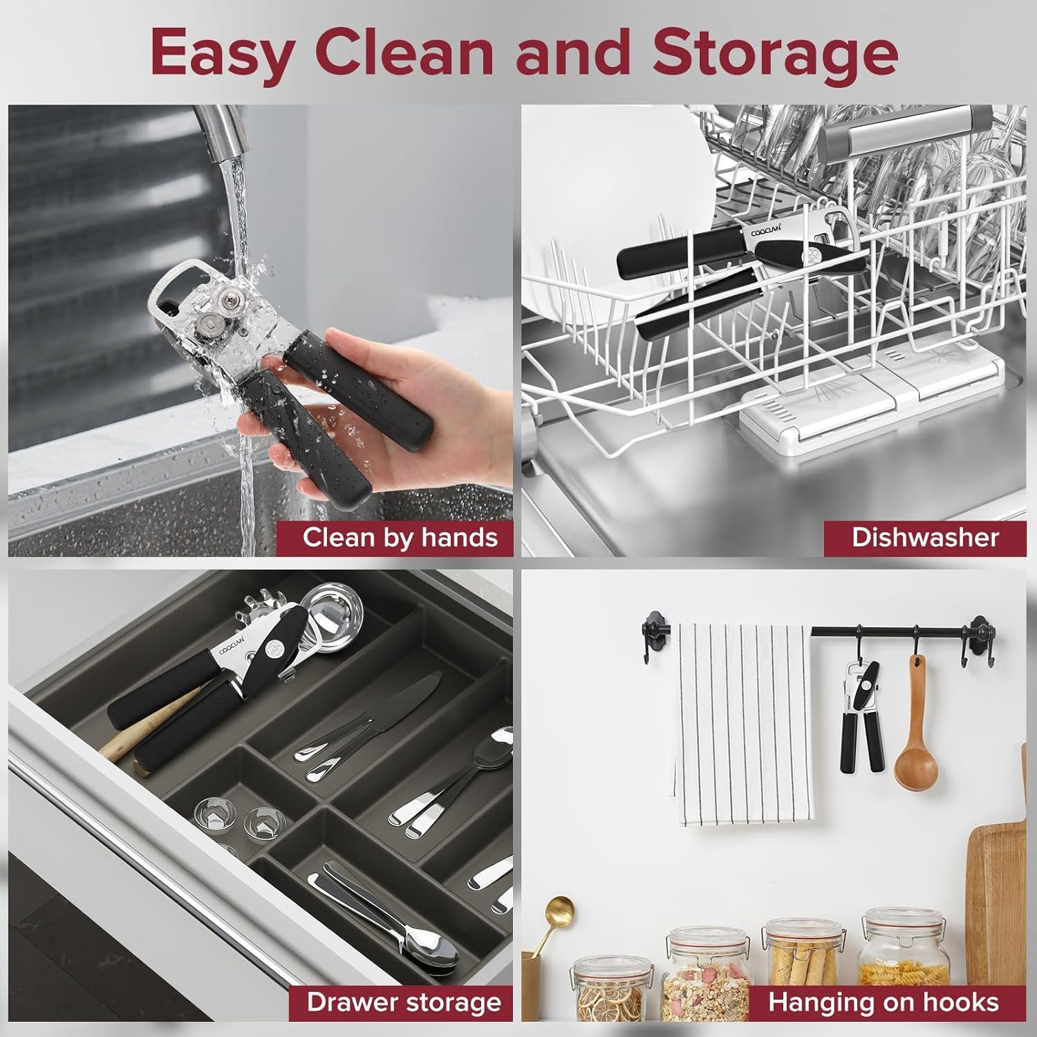Dishwasher Safe & Space-Saving Storage: The can opener very easy to clean, just wash by hand or dishwasher, the bottle opener hole support to hang on hooks