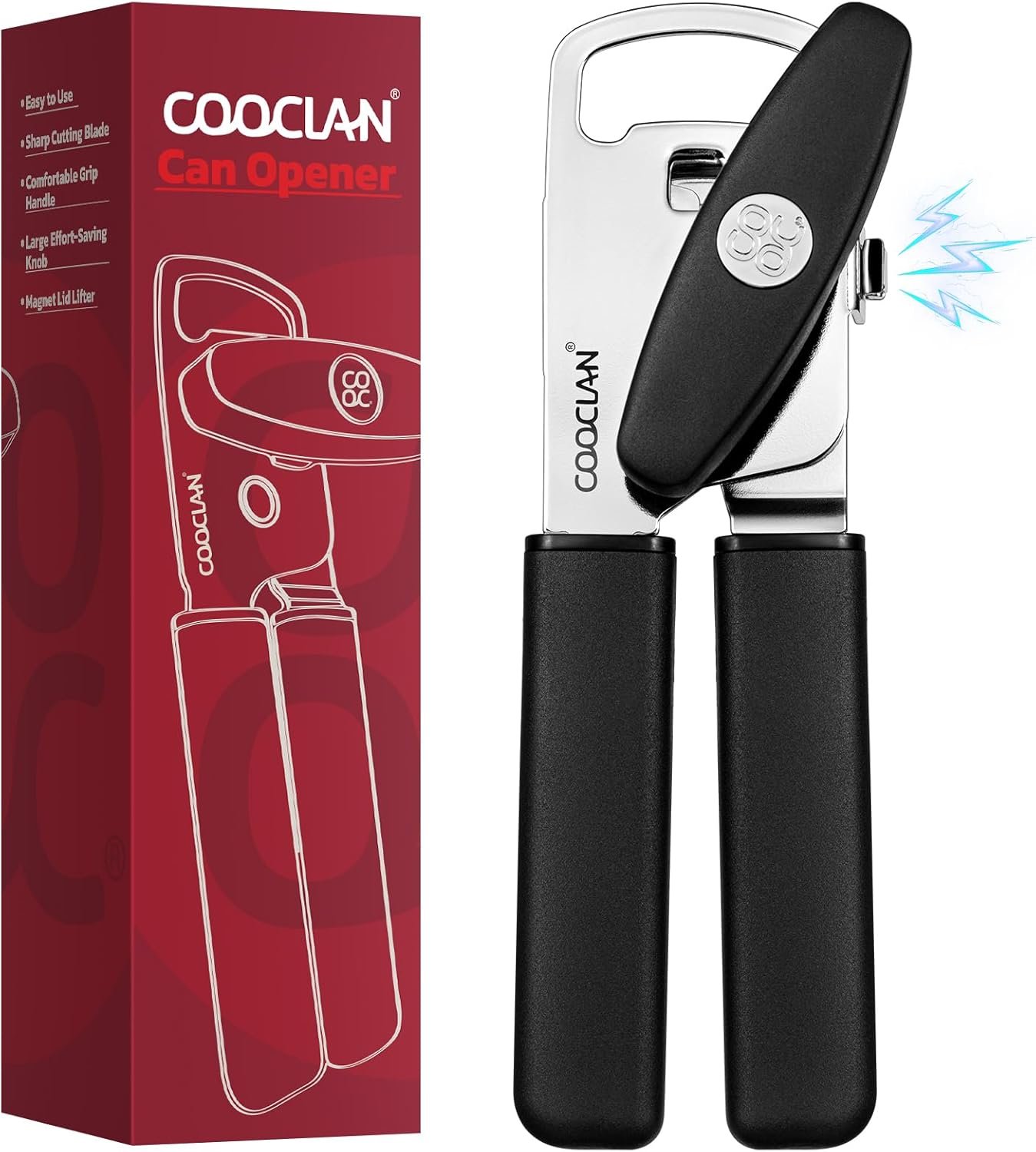 Can Opener Manual with Magnet, Heavy Duty Hand Held Can Opener with Sharp Stainless Steel Blade Easy to Use, Effortless Turn Knob, Soft Comfortable Handle, Built-In Bottle Openers, Black