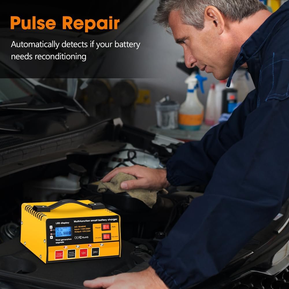 【5-stage Pulse Repair】Adopt pulse width modulation technology; for battery charging to repair the internal resistance and battery maintenance (automatically detects if your battery needs repair). When the battery is fully charged, the charger automatically switches to trickle mode to provide a weak current to balance the full charge value