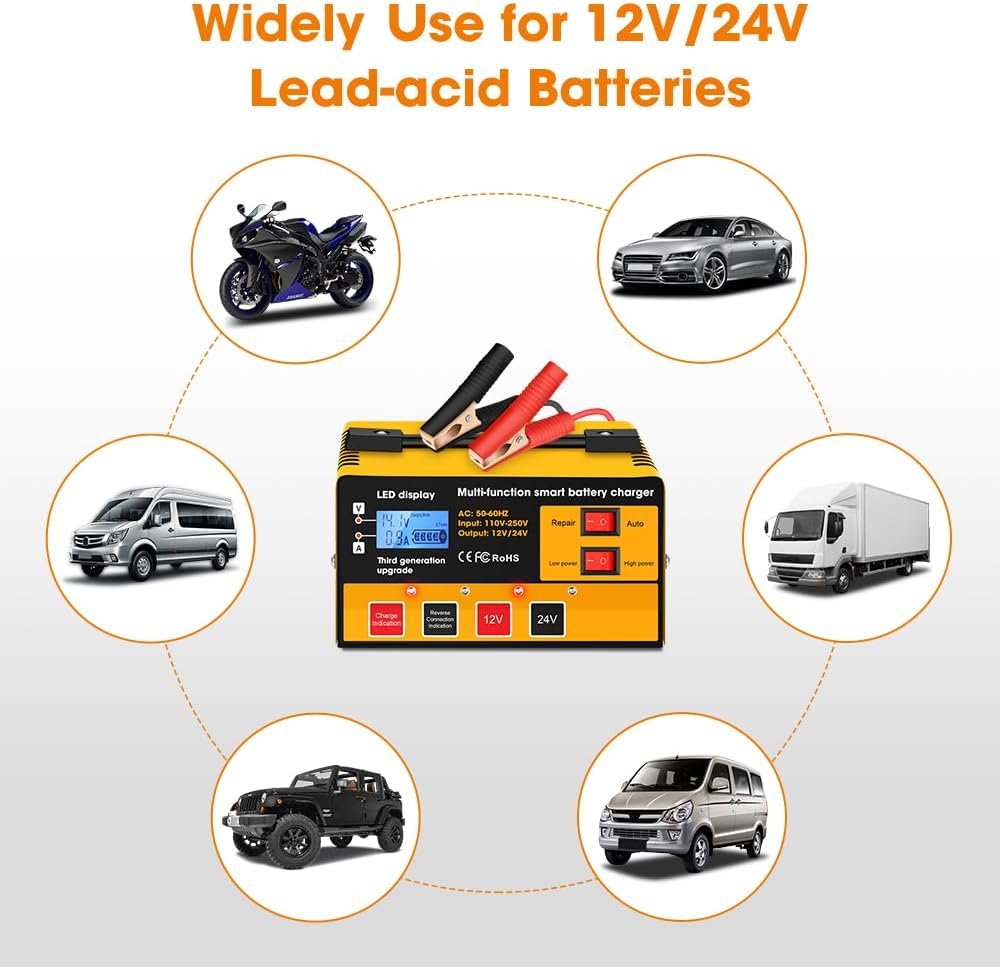 【FAST CHARGING】The charger is designed for 12V/24V batteries. Input voltage: 100-240V AC, Battery range:12V/10AMH(max); 24V/7.5AMH(max). Automatically adjust the charging current, easy to deal with a variety of harsh voltage environments, quickly charge the battery. Suitable for charging any lead acid, Flooded(WET), GEL, Calcium type deep cycle, maintenance free and AGM batteries with capacities up to 6-105Ah (Amp-hours).
