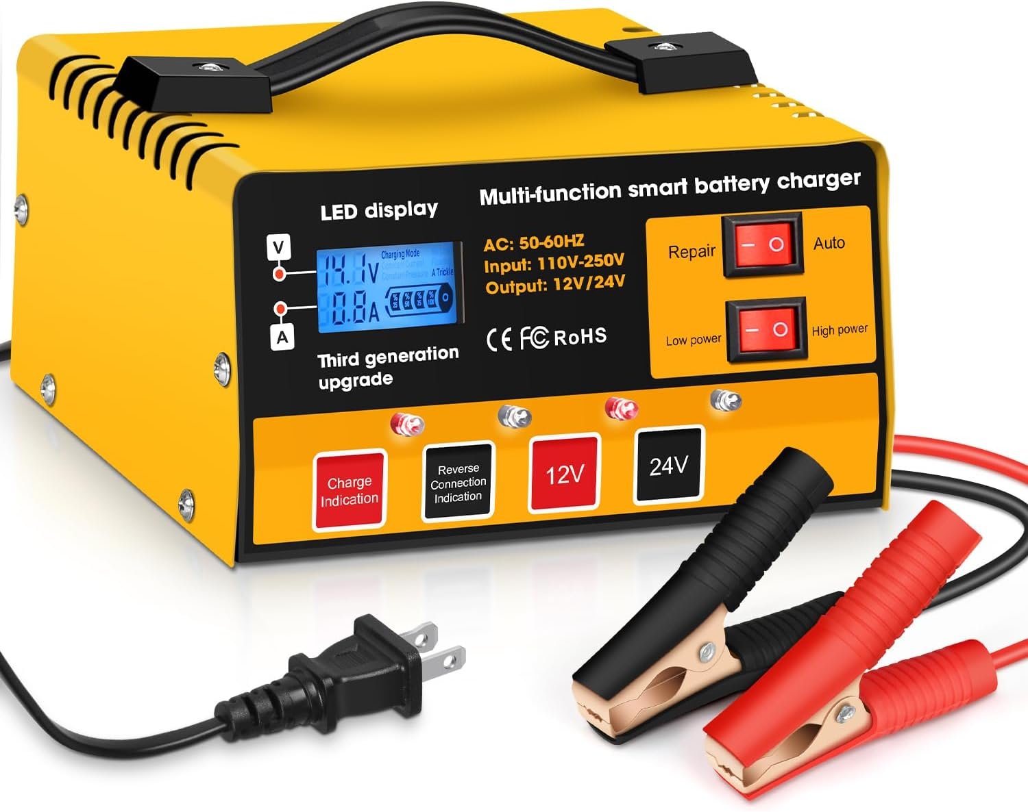 【INTELLIGENT LCD DISPLAY】The automatic intelligent charger can display current and voltage without manual adjustment, making it easier to charge your battery. Automatic mode of battery charger: fully intelligent charging and maintenance of battery, no extra operation required. Manual mode: adjust the charging mode, for example, you can continue charging after the automatic mode is charged.