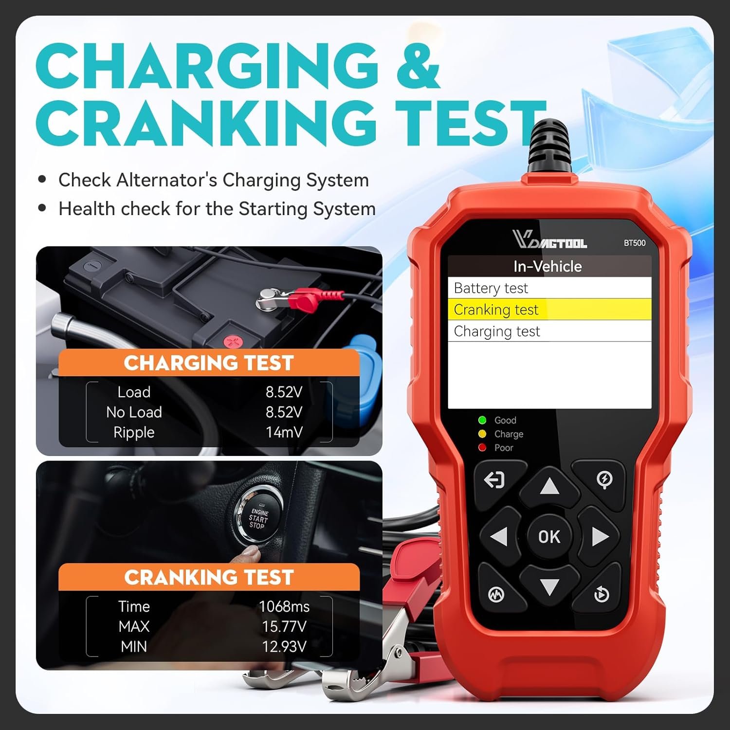 【STARTER & ALTERMATOR TESTER】 BT500 alternator tester can perform cranking test of the vehicle starter motor and check whether it is cranking properly or not, charging test of the alternator to prevent overcharge or incomplete charge. Note: Please turn off all electrical devices (such as air conditioner, headlights, stereo or other electrical equipment)during the charging test.