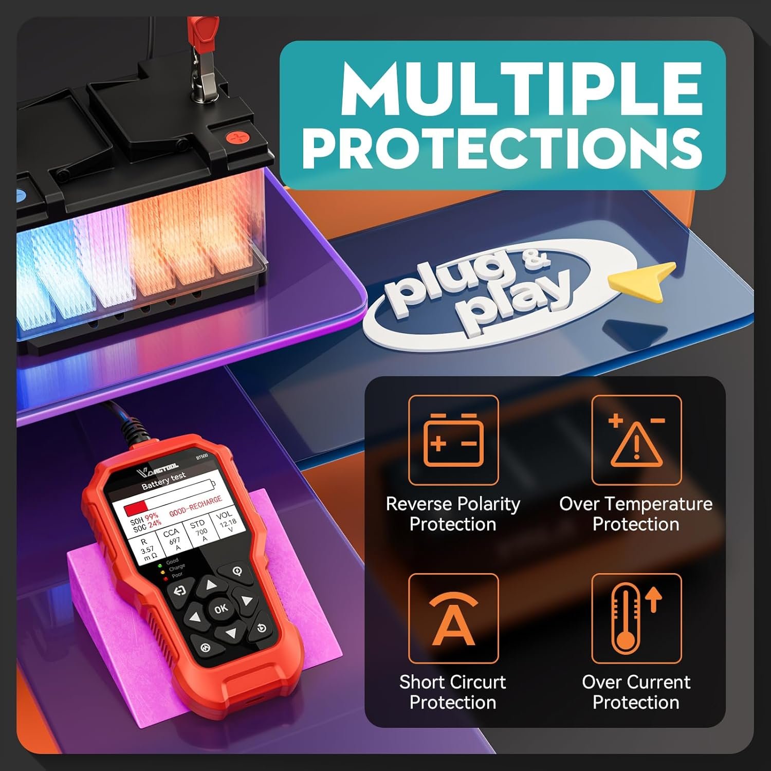 【 99.99% ACCURACY & SAFE DESIGN】 BT500 battery checker tester thanks to it’s powerful intelligent chip, the test result is up to 99.99% accurate. The test results can be stored and reviewed on the screen directly. Equipped with 100% high-quality safety copper clip, which has reverse polarity protection and spark-proof function, over-voltage protection and over temperature protection.