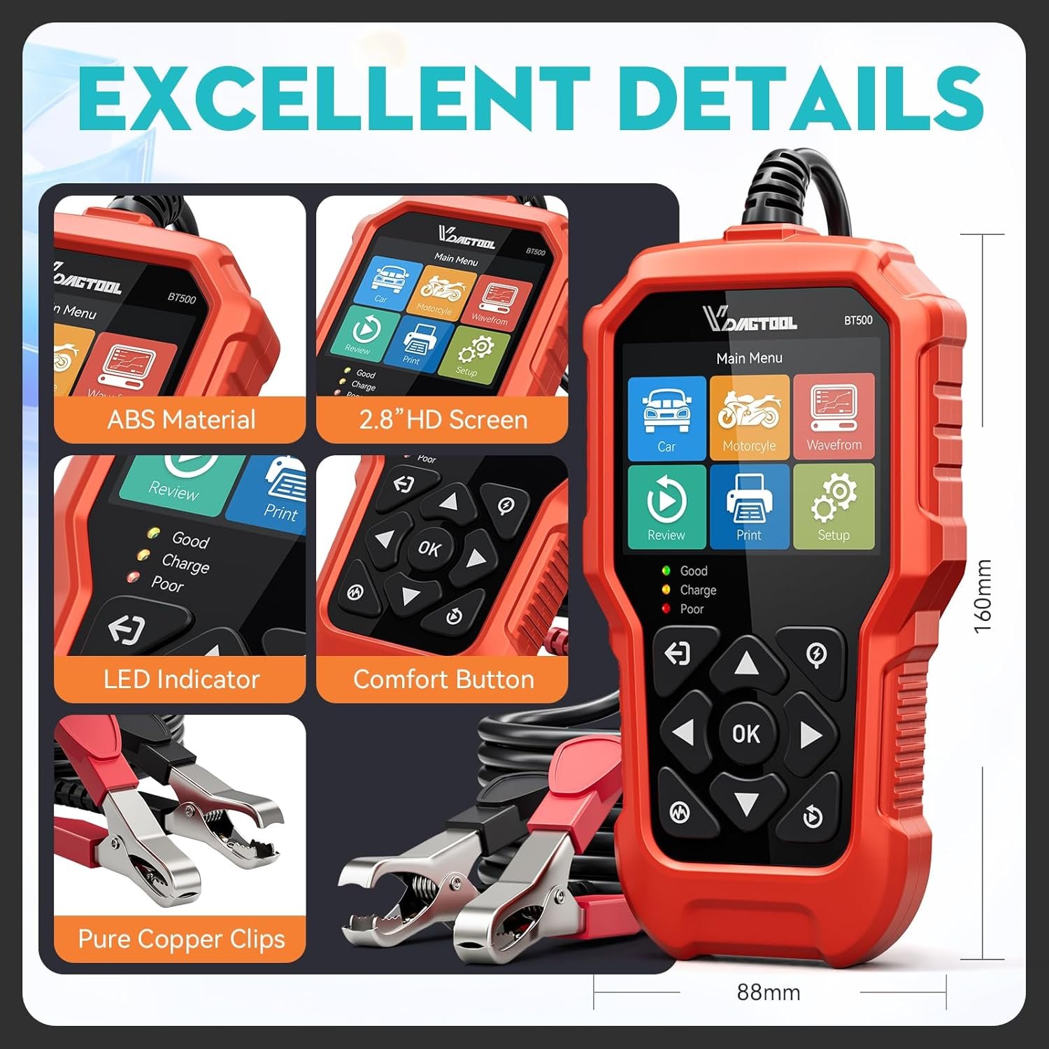 Car Battery Tester 6V 12V 24V VDIAGTOOL BT500, 5-3000 CCA Battery Load Tester, Starter Alternator Tester Automotive Charging Cranking System Analyzer for Car Truck Motorcycle SUV ATV Boat
