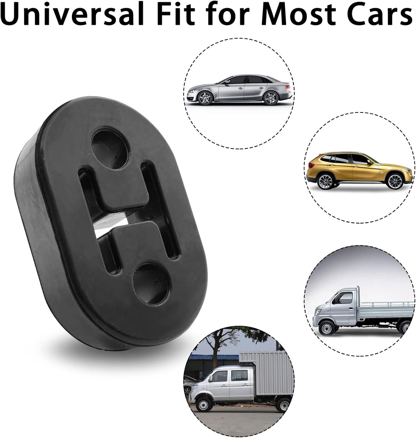 Universal Accessories: This rubber exhaust hanger fits most cars that use an easy-to-replace hanger system, consisting of two holes and a rubber-lined insulator bracket. Be sure to check the size and distance between the hooks before use to ensure the product is suitable for use.