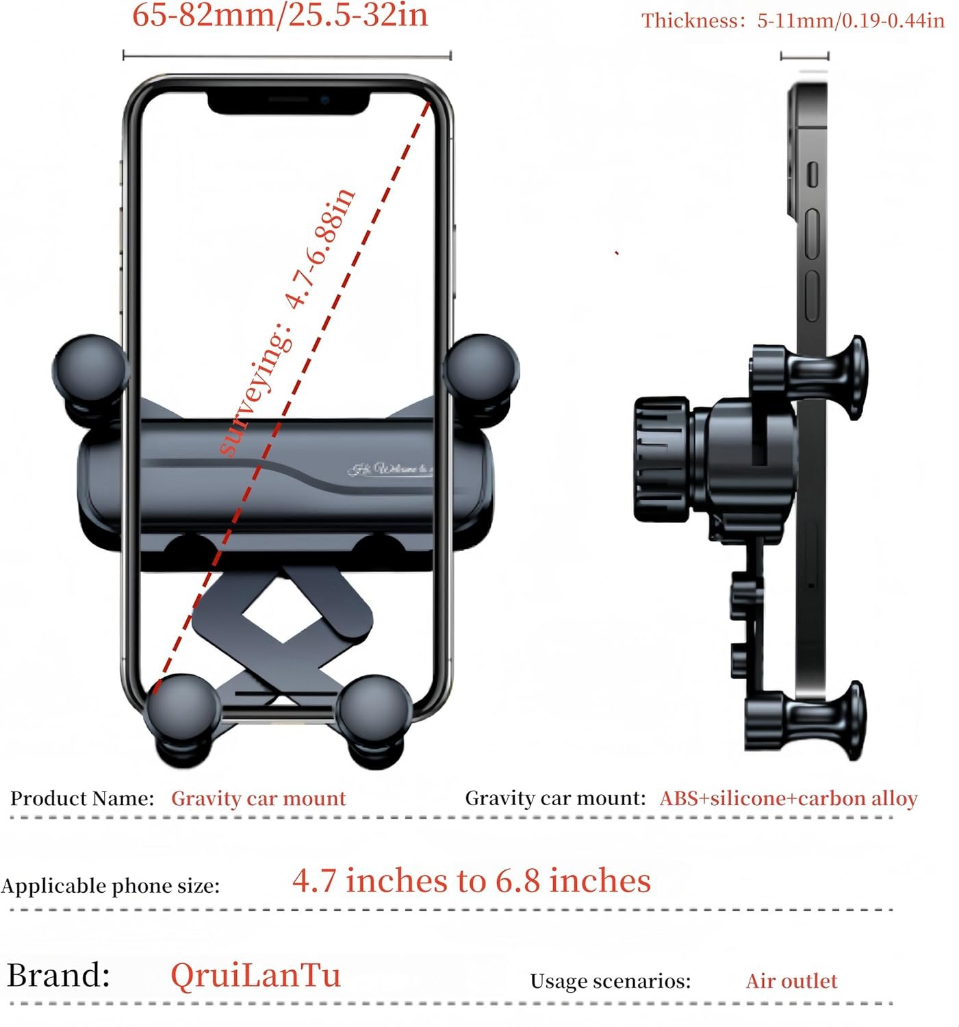 【Enjoy the Comfort of the A/C】: With the unique extension-arm and free angle adjustment gravity six-point mechanical support this car mount can make your phone avoid the influence of a/c airflow (No damage to the life of the phone), and can also help you get the comfort brought by the a/c in the car to a greater extent (No blocking airflow). Your driving will be happier and more enjoyable. It is the best choice for your air vent phone holder.