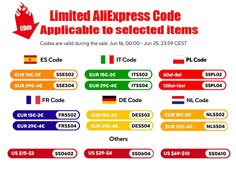 Codes are valid during the sale:Jun16,00:00-Jun 25,23:59 CEST