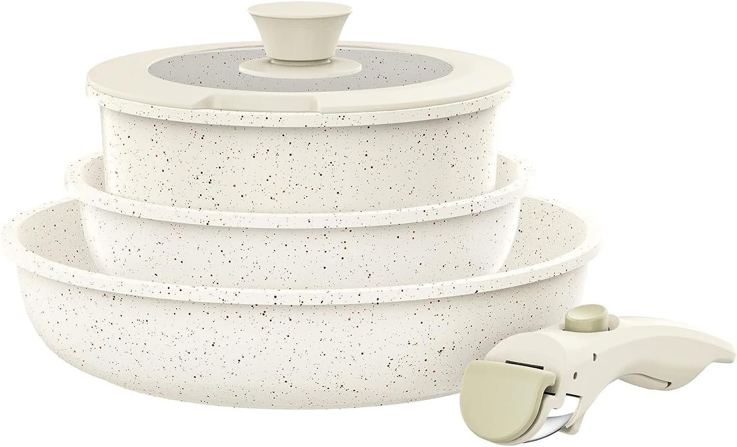 CAROTE Nonstick Cookware Sets, Non Stick Pots and Pans Set Detachable Handle, Kitchen Cookware Sets with Removable Handle, Stackable RV Cookware for Campers, Oven Safe (White 5 PCS)