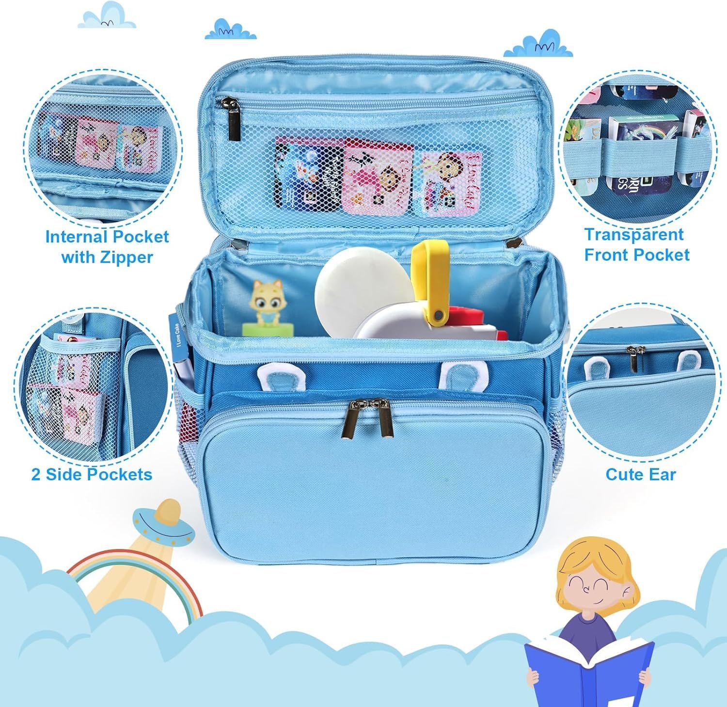 Special Feature:Transparent Pockets Allows displaying for story characters and easy access to books. And its Elastic bands secure books and characters to prevent movement and damage during transport. Zipper front pocket with Cute ear design makes it a sound choice for your little Boy