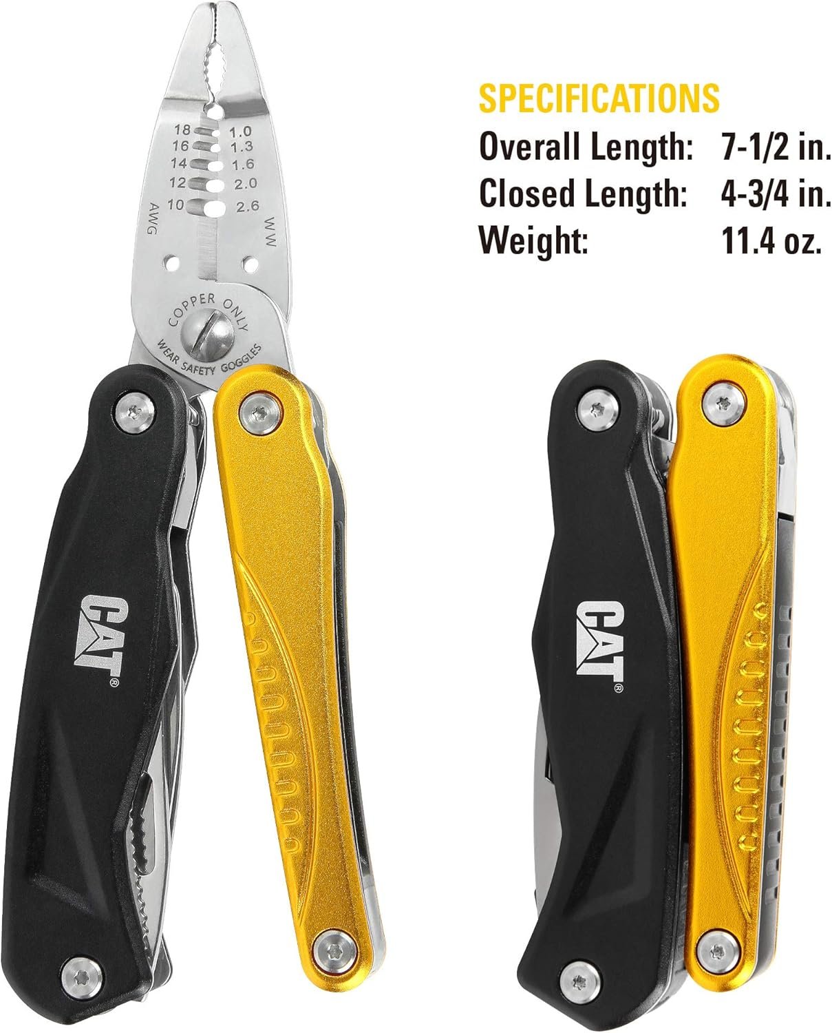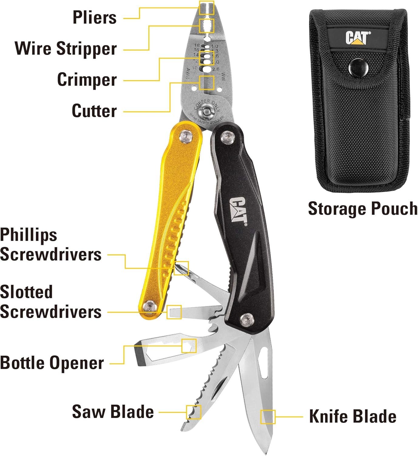 Wire Stripper and CrimperWire Cutter and BenderBottle OpenerSlotted and Phillip ScrewdriverKnife and Saw4-Way Wrench and Pliers
