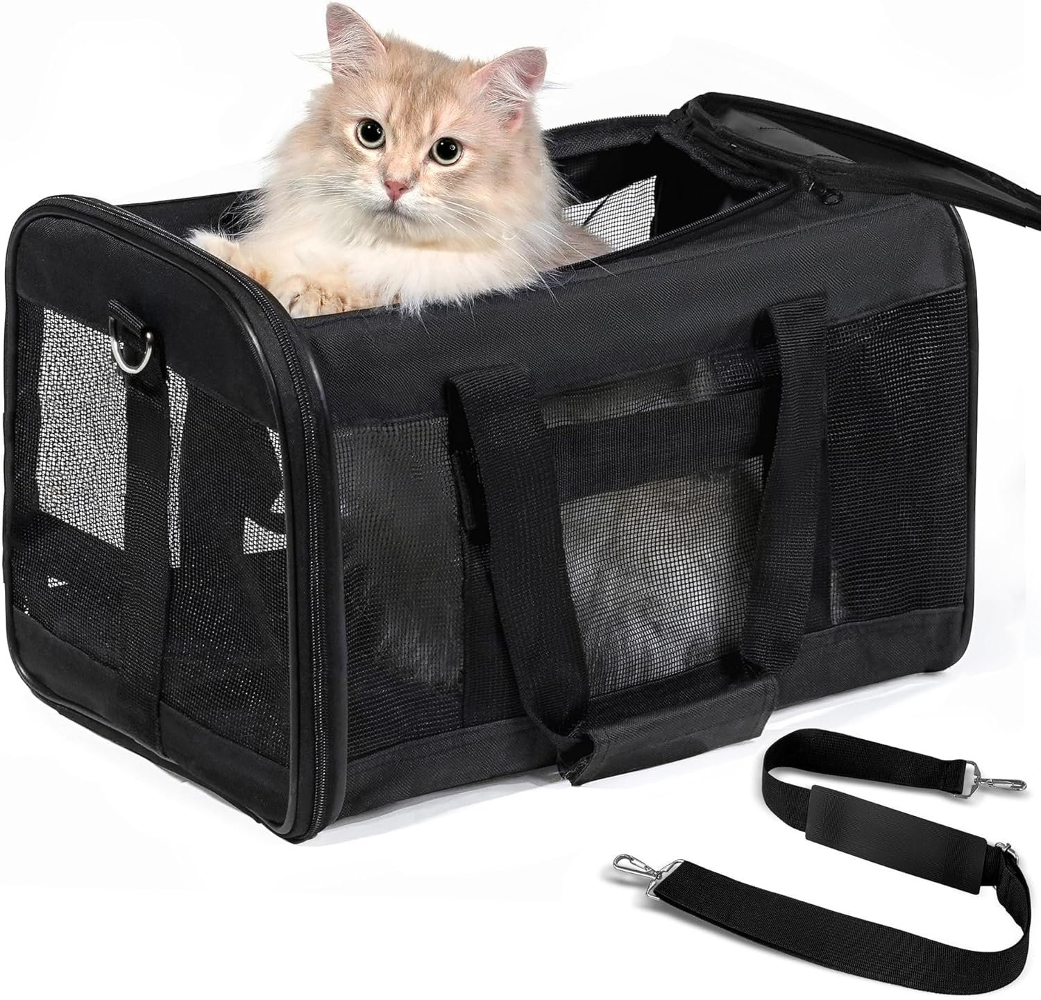 Cat Carrier Airline Approved, Soft-Sided Dog Carrier with Inner Safety Leash, Pet Transport Carrier for Small-Medium Cats Puppies up to 15 Lbs, Collapsible Travel Kitten Carrier Bag -BlackM