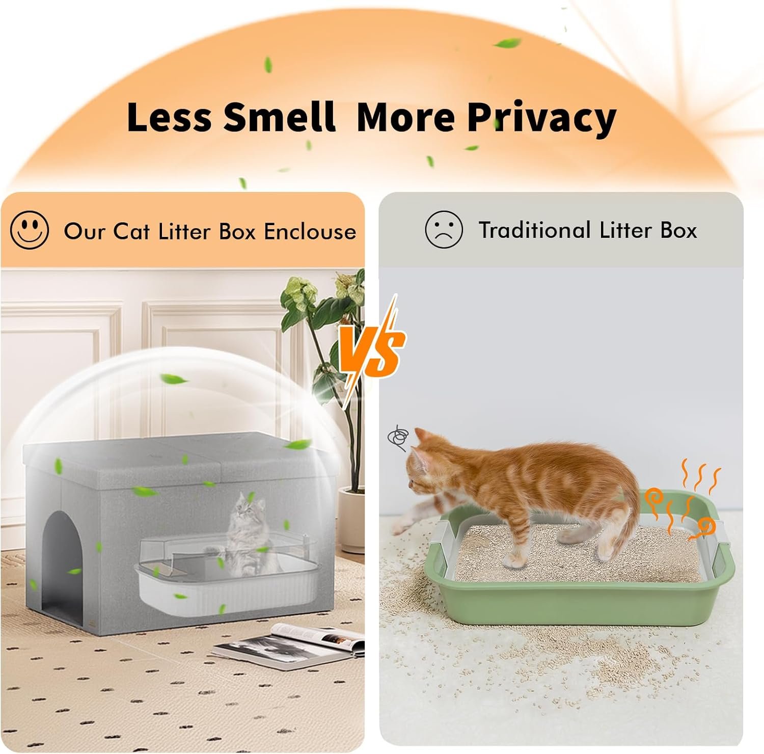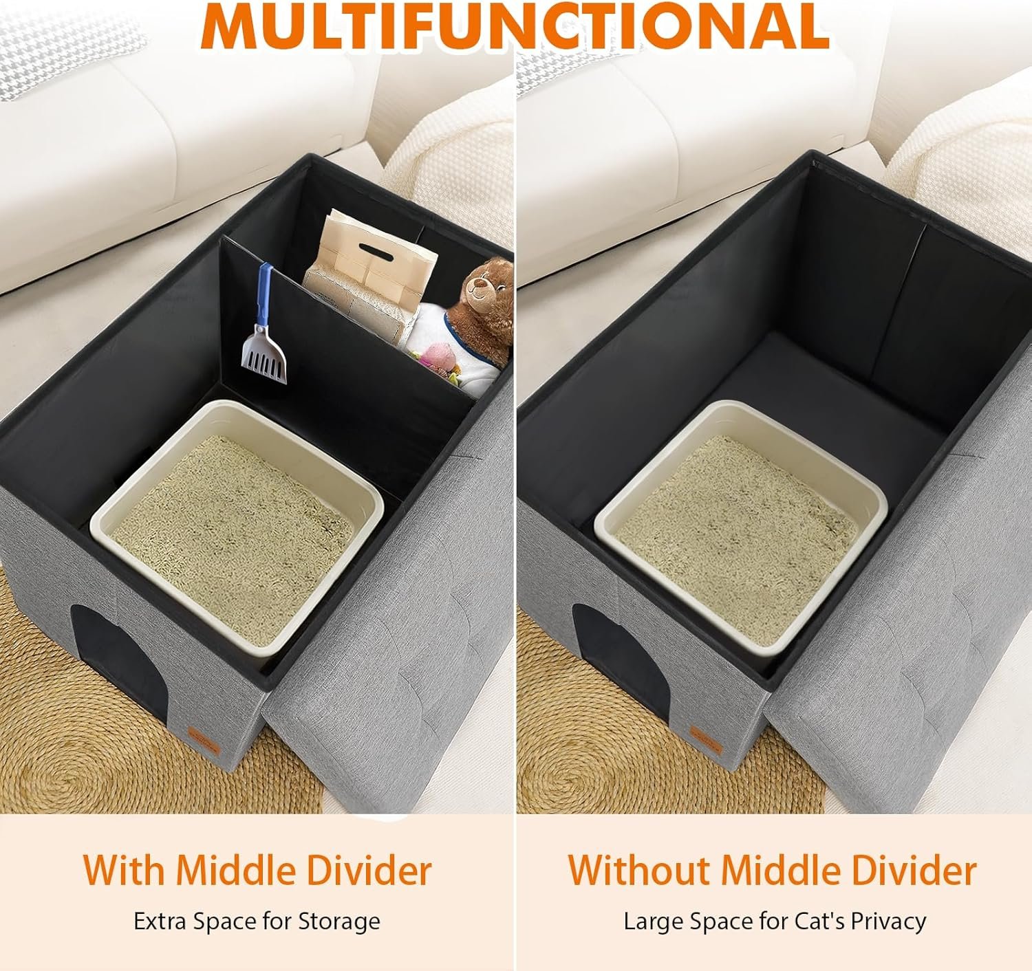 【Easy to Assemble and Really Sturdy】The hidden litter box enclosure furniture is a breeze to put together, taking just a few minutes. You can start using it right away by unfolding the cat litter box cabinet and popping on the lid. It can support a maximum weight of 200 lbs with its divider.