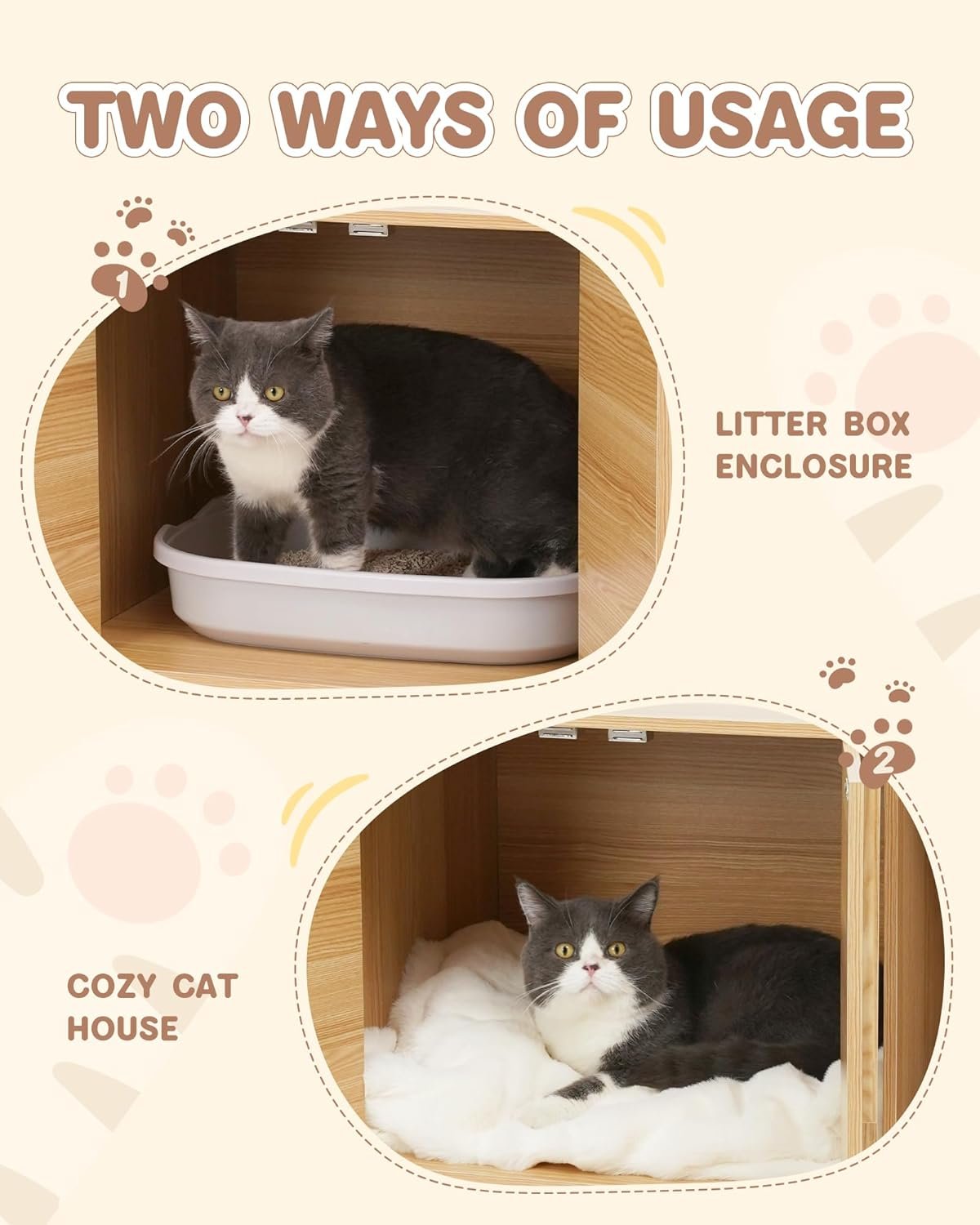 MULTIFUNCTIONAL CAT HOUSE WITH COUNTERTOP: With a spacious 31″x20″countertop, load capacity 110lbs, The cat litter box enclosure suitable for a variety of decorative storage items, such as vases, lamps, books or your favorite collection of small items. This cat litter box enclosure is very versatile and can be used as a pet house, storage cabinet, nightstand, or entryway bench.