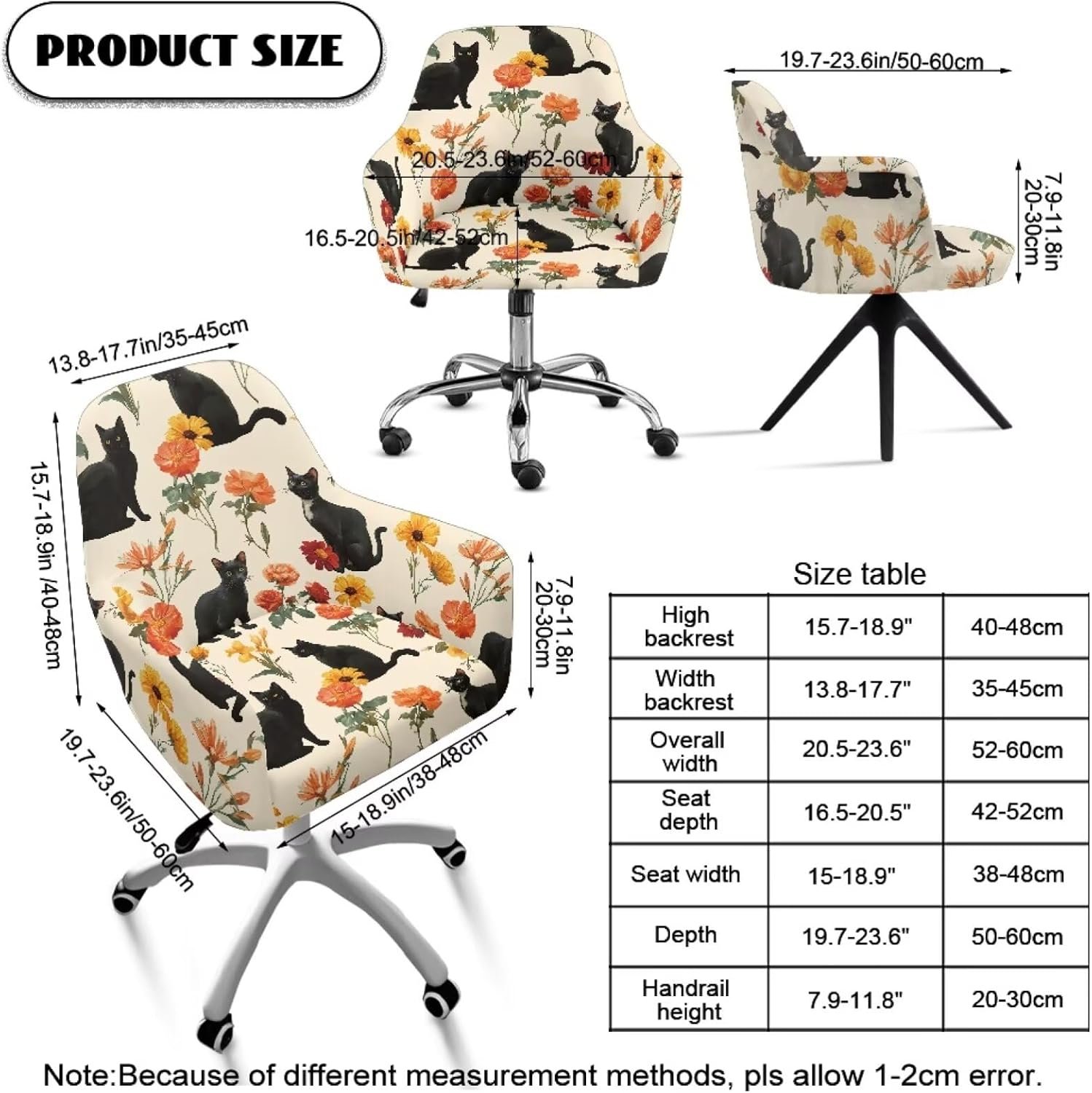 Size: Our chair cover fits chair with back height (above seat): 15.7-18.9in,back width:13.8-17.7in,overall width: 20.5-23.6in,seat depth: 16.5-20.5in,seat width: 15-18.9in,Over Depth: 19.7-23.6in,arm height:7.9-11.8in; Please take care of the size before purchasing