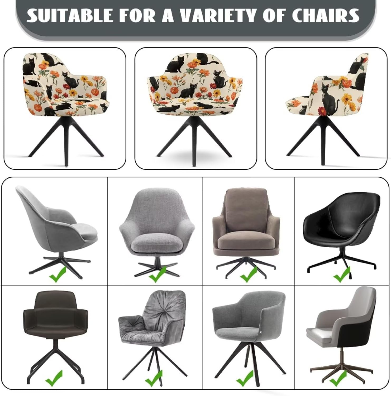 These stretchy covers fit swivel chairs with back heights of 15.7″-18.9″, seat depths of 16.5″-20.5″, and armrests up to 11.8″. The elastic hem ensures a snug, slip-free fit, hugging every curve without gaps or bunching. Always double-check our size chart for compatibility!