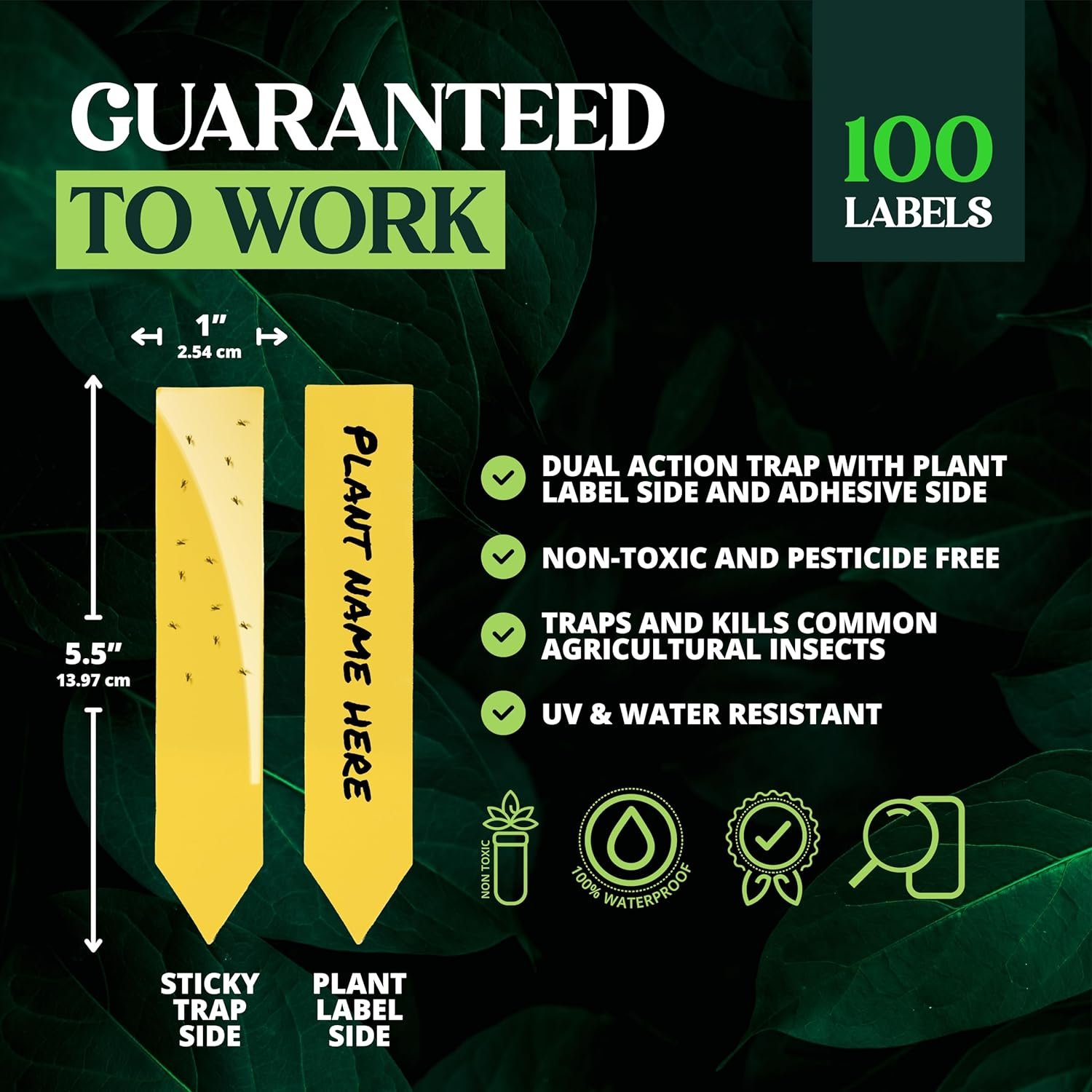 Catchmaster Dual Action Plant Labels 100 PK, Sticky Insect Trap Plant Stakes, for Live Plants Indoor Outdoor, Fruit Fly Trap, Glue Traps for Home, Farm, Garden, Hydroponics & Greenhouse, Pest Control