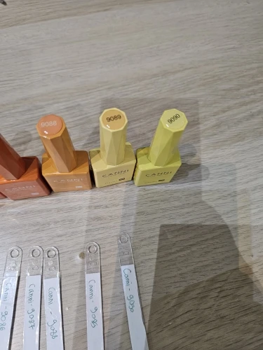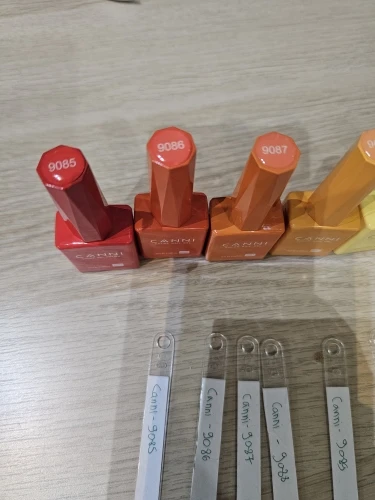 I like the colors there are opaque colors and some are translucent. The brash is very convenient to apply is thin and oval shaped. The delivery to israel took a bit of time but it was worth the wait. Thank you canni. I applied the color is 2 layers. The yellows were 3 colors layered. 9090 is a cool tone sunny yellow color. And 9089 is a warm tone yellow color. 9088 is an translucent cool tone orange color. 9087 is a translucent warm orange. 9086 is an ripe orange color. And 9085 is opaque tomato red color.