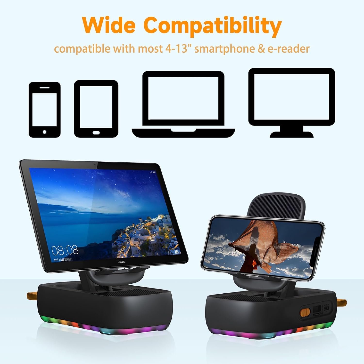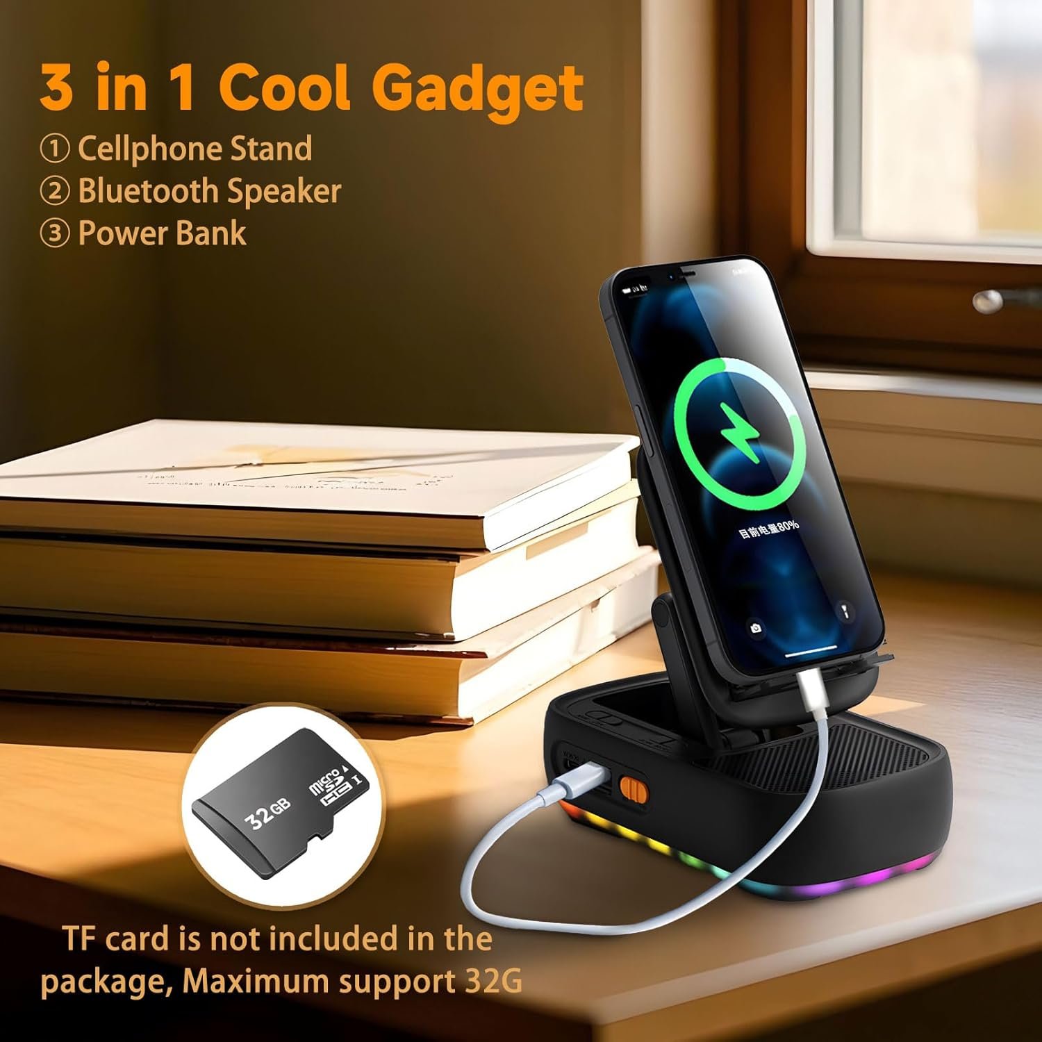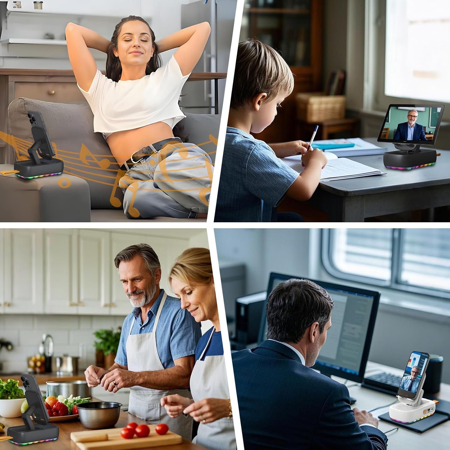 【Stable and Anti-slip】A Bluetooth speaker with a stand is a practical gift. The back and bottom of the phone seat are fully covered with non-slip silicone to provide maximum protection for your device, preventing any scratches and sliding.