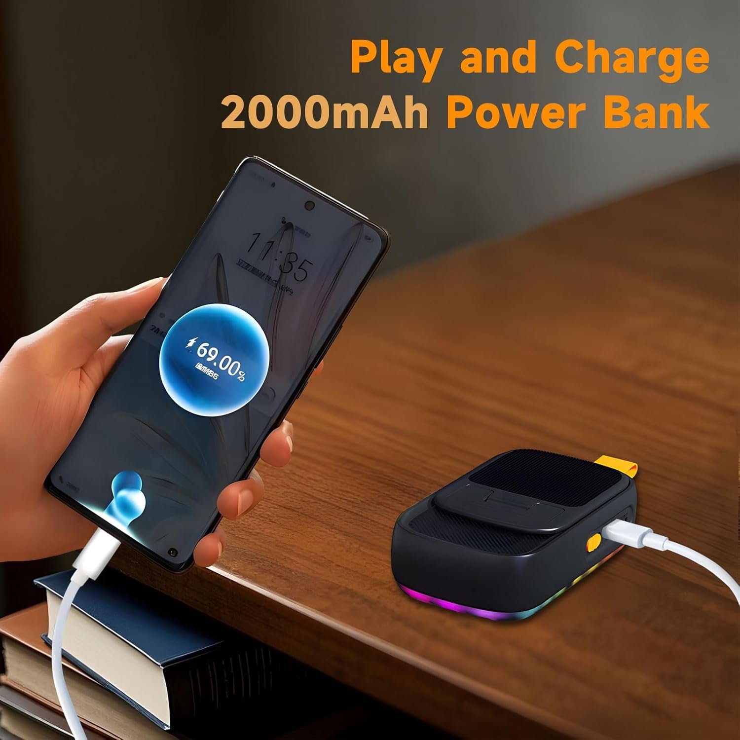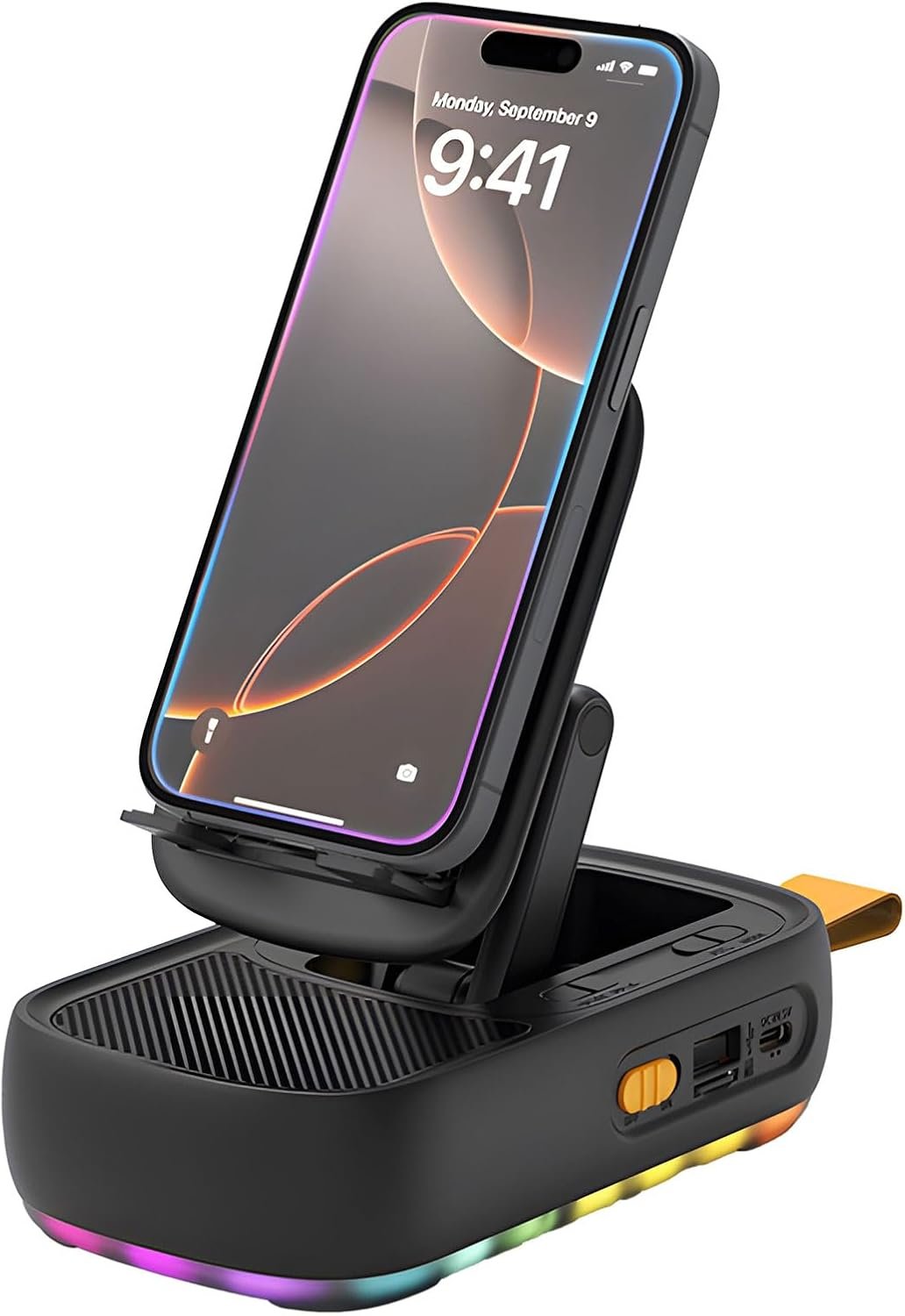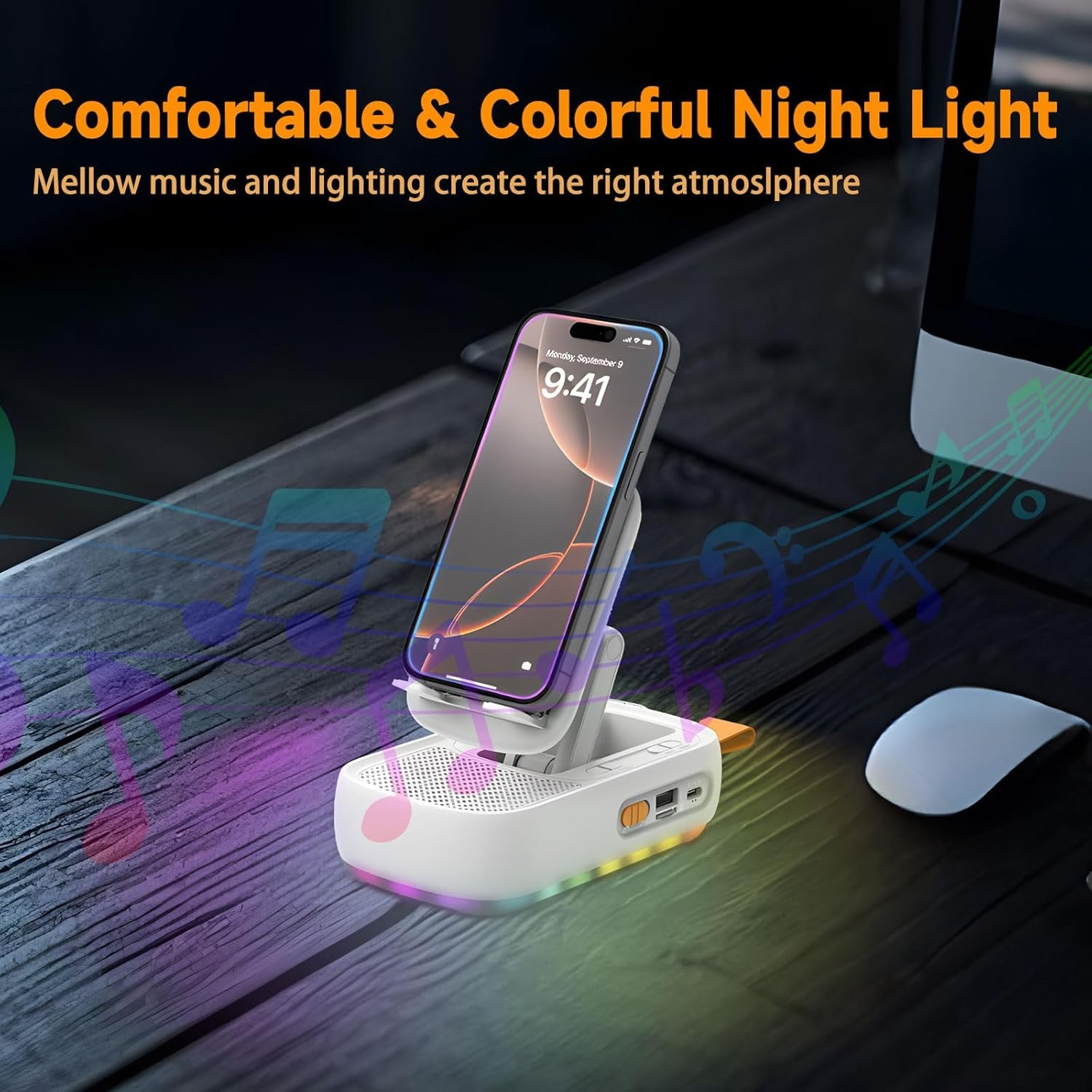 【3-in-1 Bluetooth Speaker + Phone Stand】A versatile device that combines wireless induction speaker, Bluetooth speaker, charging, phone stand and ambient light in one, with a built-in 5W power speaker that delivers HD stereo surround sound at any volume level to enhance the audio experience. The upgraded Bluetooth speaker comes with a USB port for charging in case of an emergency.