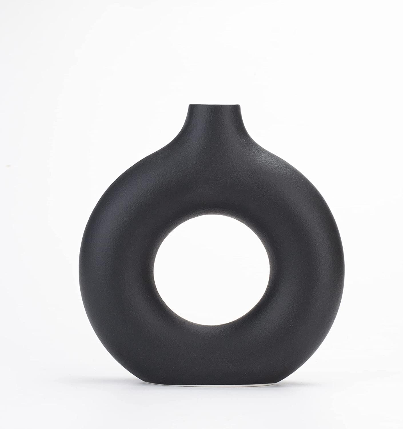 CEMABT Black Donut Vase Hollow Ceramic Vase for Flowers Handmade Minimalist Boho ins Style Modern Home Decor for Wedding Dinner Table Party Living Room Office Bedroom(M