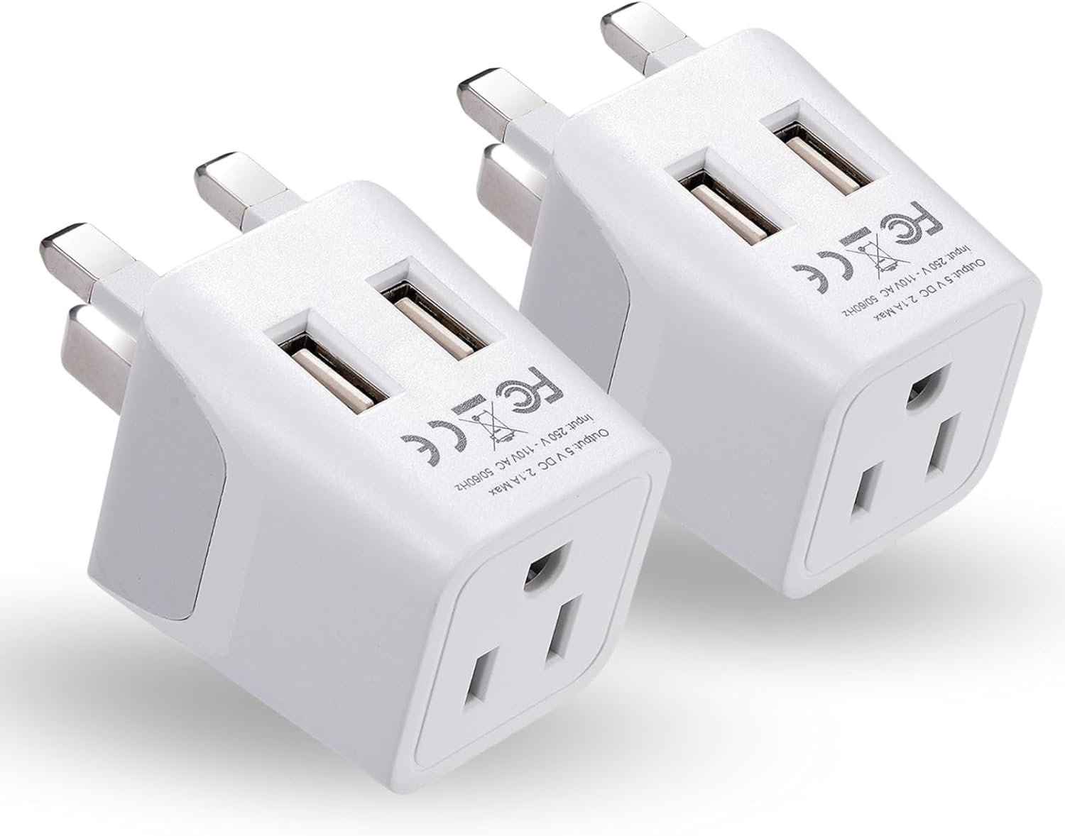 Ceptics UK, Hong Kong, CTU-7-2PK Ireland Travel Adapter Plug with Dual USB – Type G – London – USA Input – Light Weight – Perfect for Cell Phones, Chargers, Cameras and More – 2 Pack