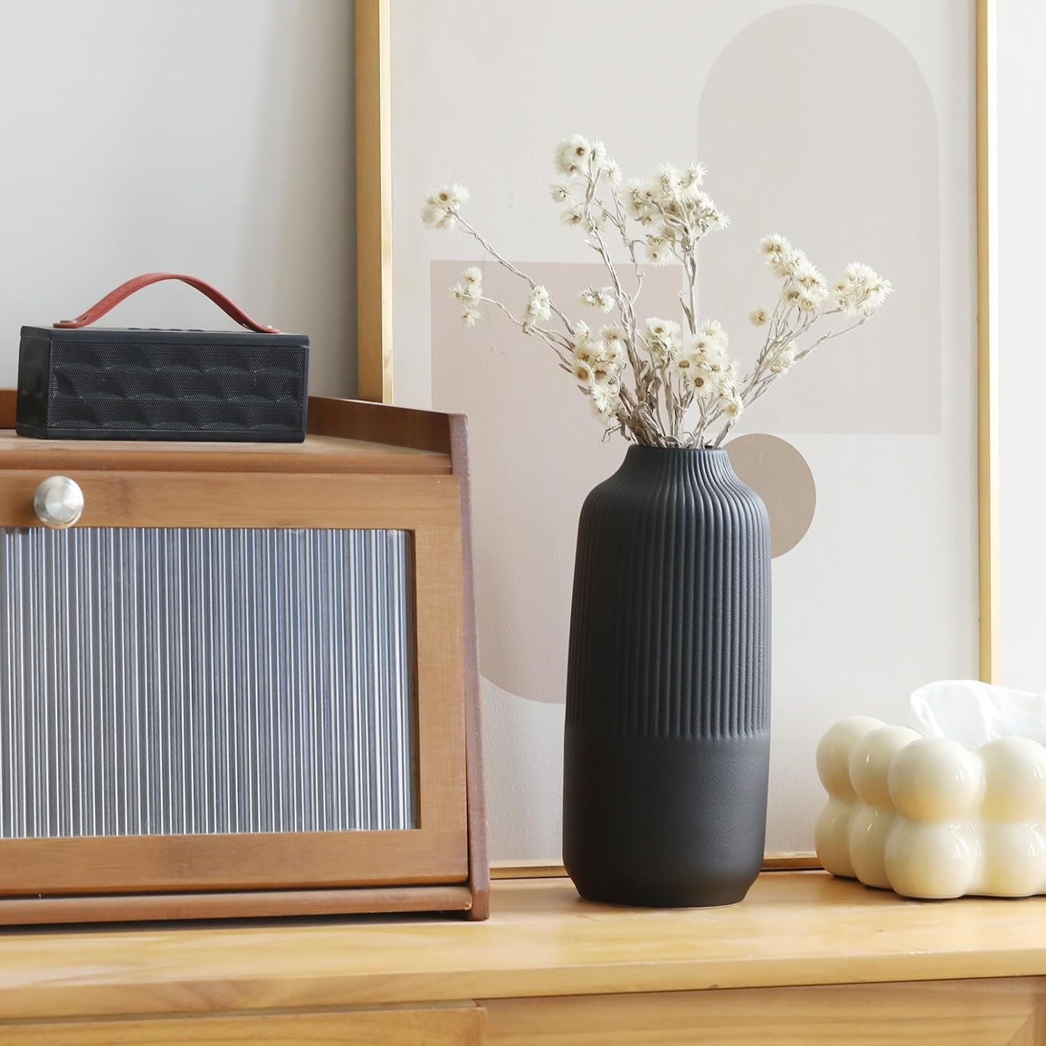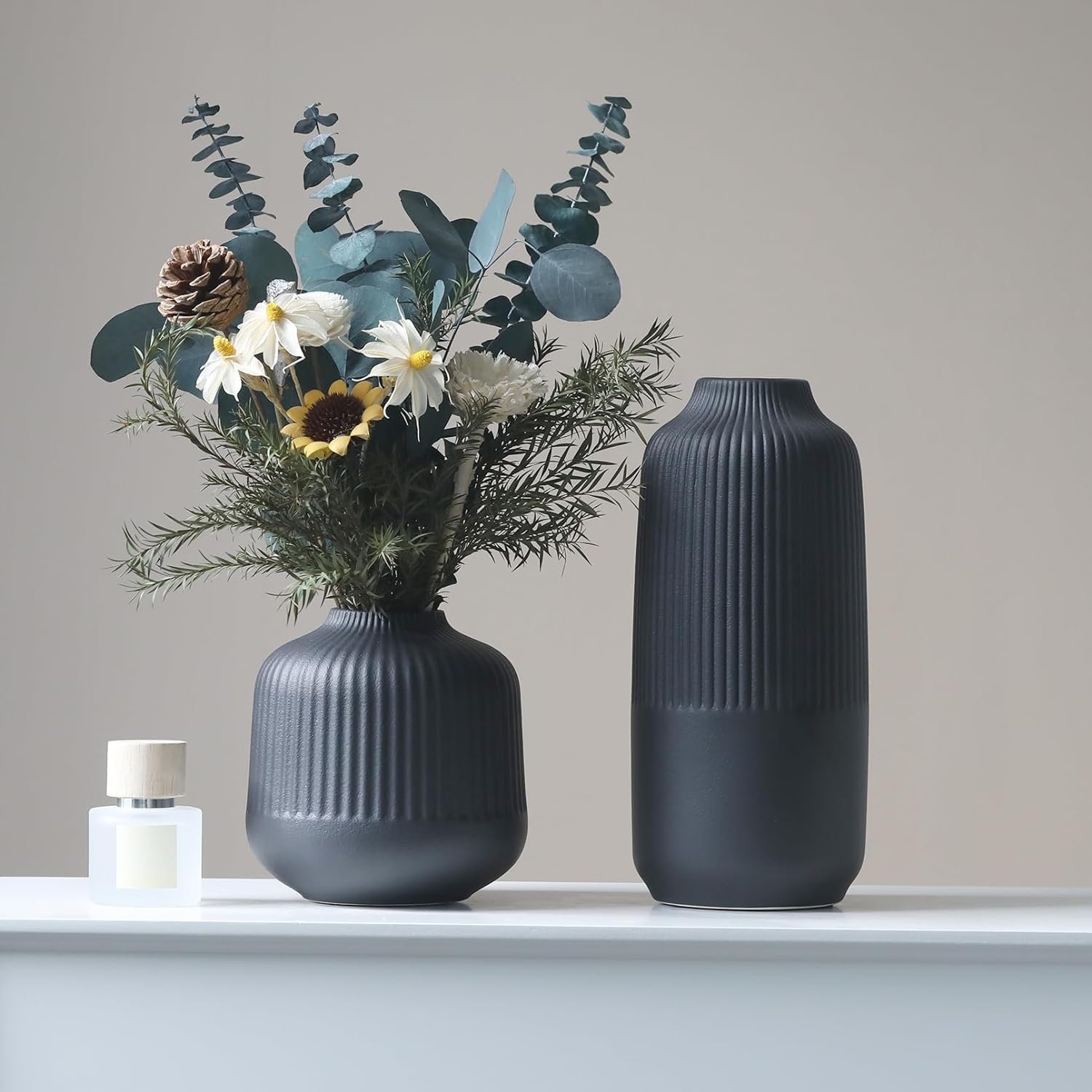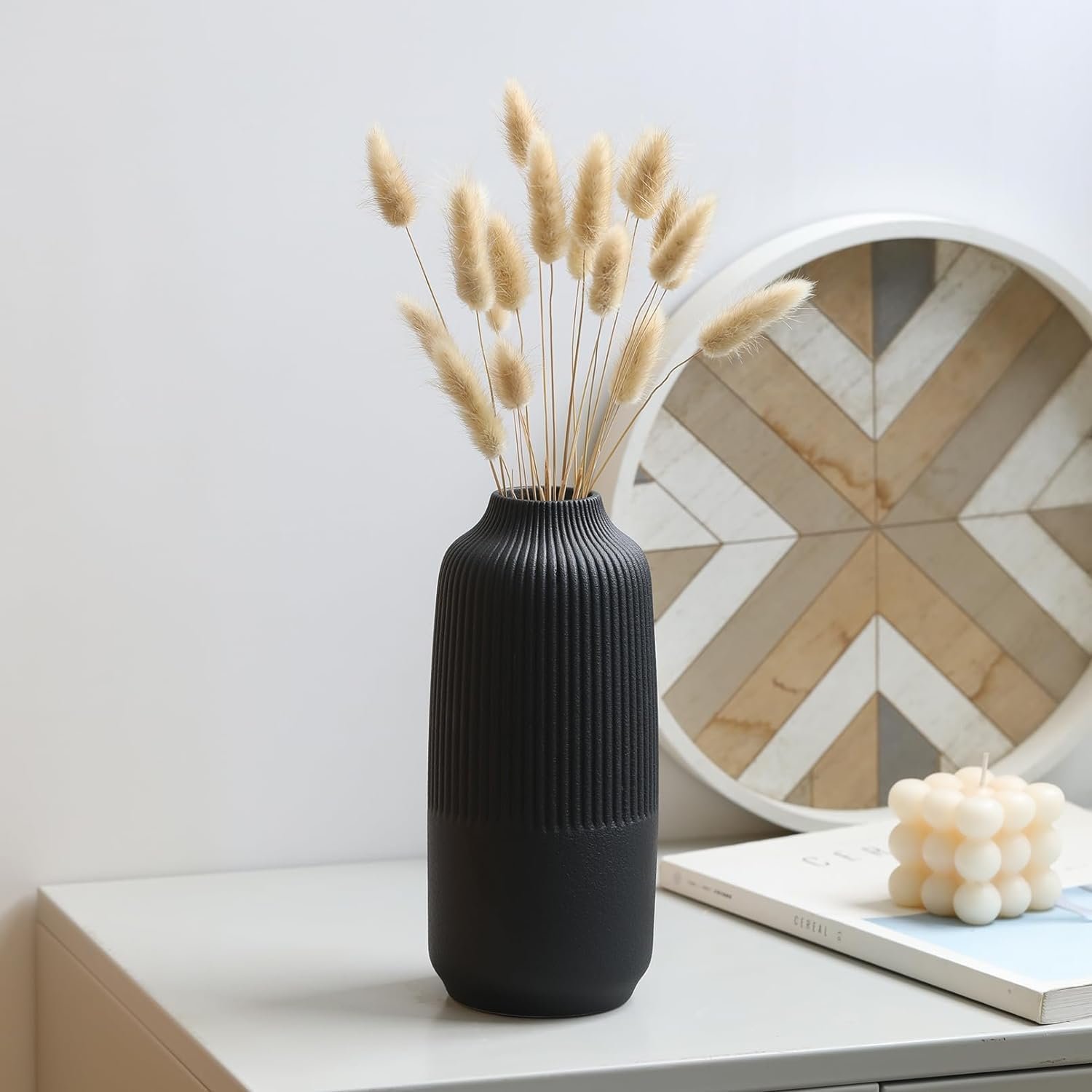 Attractive Ribbed Vase: this home decor vase made of high quality ceramic, it’s perfect matte black shade and the etched stripes add a subtle texture. Looks good anywhere, such as living room, bedroom, table, shelf, filled with flowers or pampas grass, adds natural beauty to you space