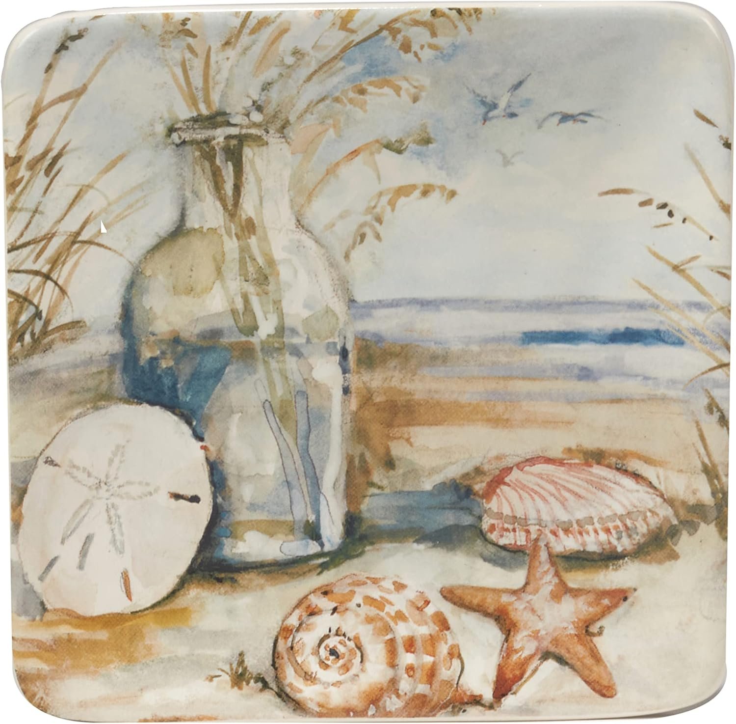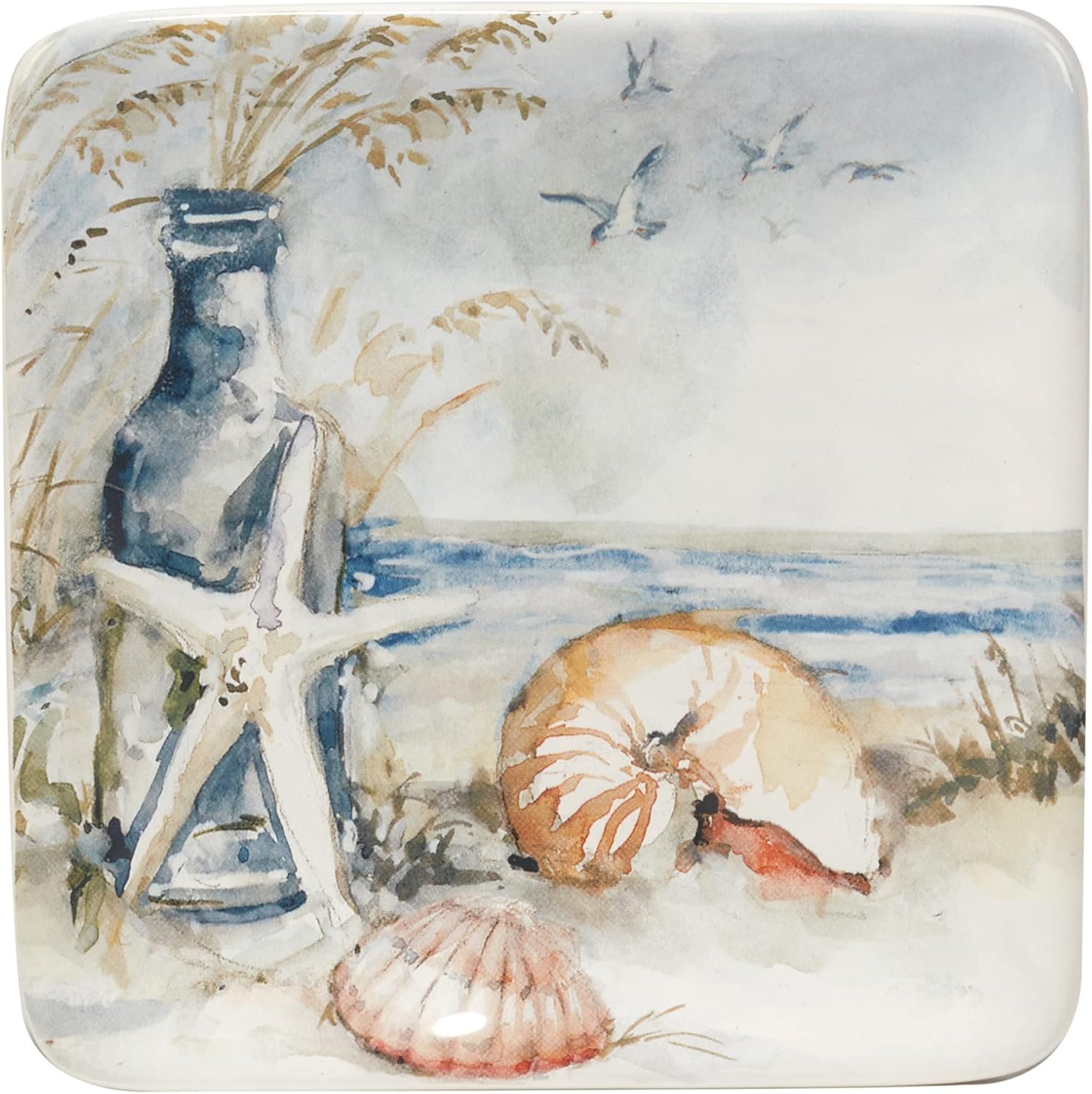 Set of 4 Unique Coastal Designs: Each 6″ ceramic square plate features a different watercolor-style beach scene with seashells, starfish, sand dollars, glass bottles, and coastal grasses. These mini works of art bring a refreshing seaside ambiance to your table, making them ideal for appetizers, desserts, or decorative use in any ocean-inspired kitchen or beach house.