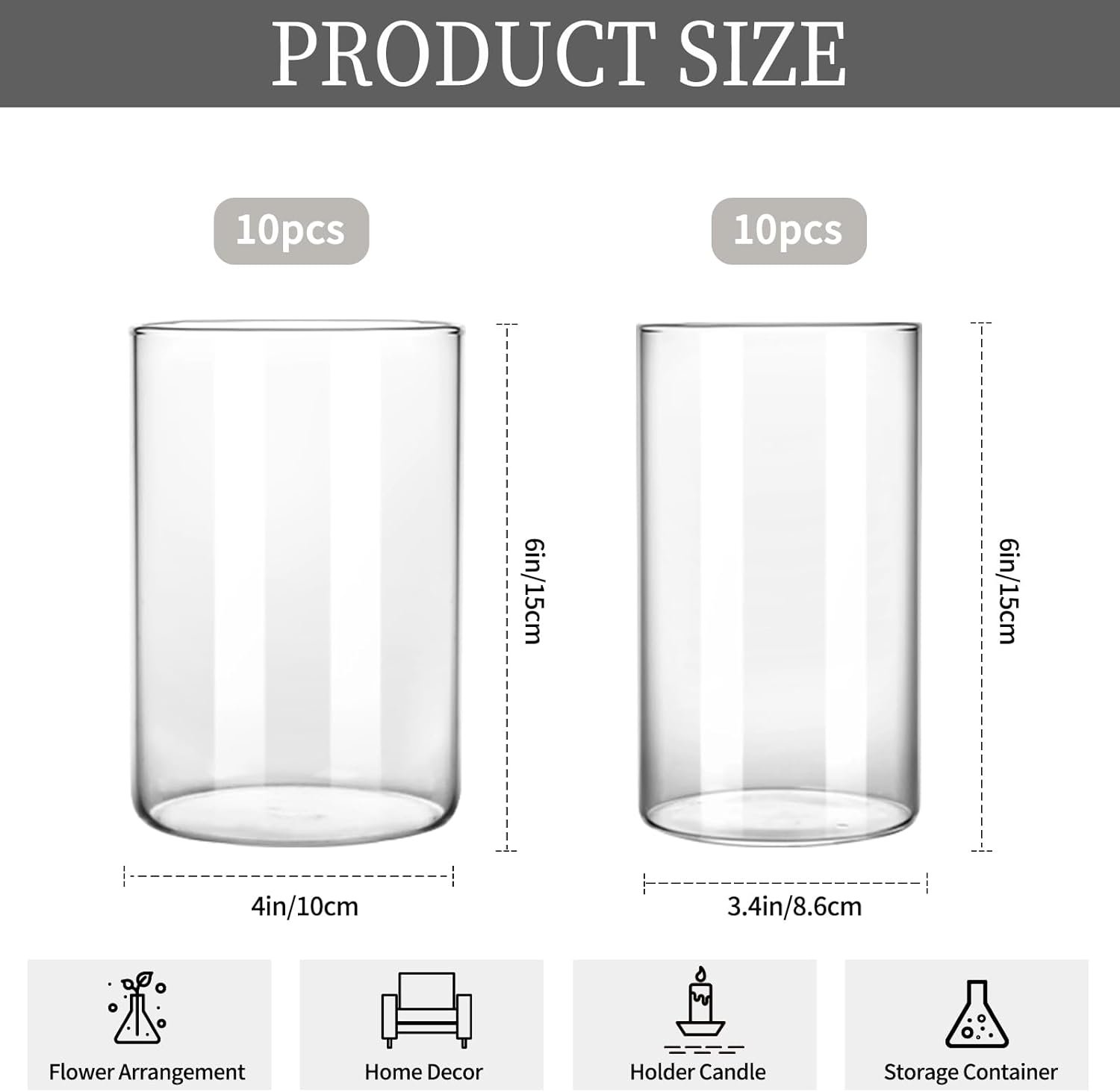 Package contains: The set contains 20 glass cylinder vases, 10 pack 6″ height & 4″ bottom diameters, and 10 pack 6″ height & 3.4″ bottom diameters. The 3.4-inch glass vase can perfectly match your 3-inch candle, and the 4-inch glass vase can be used for flower arrangements. The combination can meet your different needs.