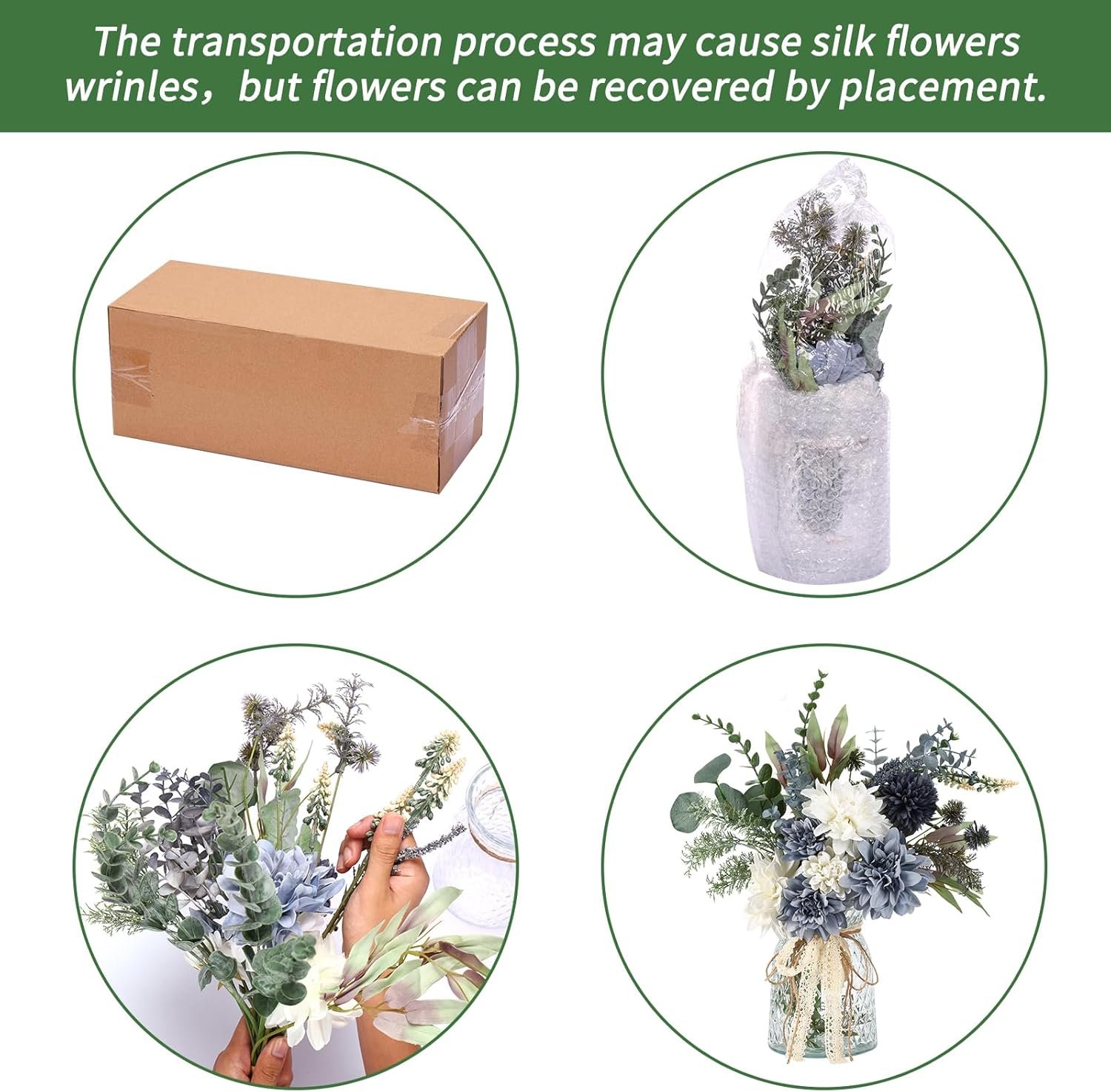 Note: Silk flowers may be crushed and deformed during shipping, but the flower heads will all return to their original shape after placement. We believe it will become more beautiful through your arrangement