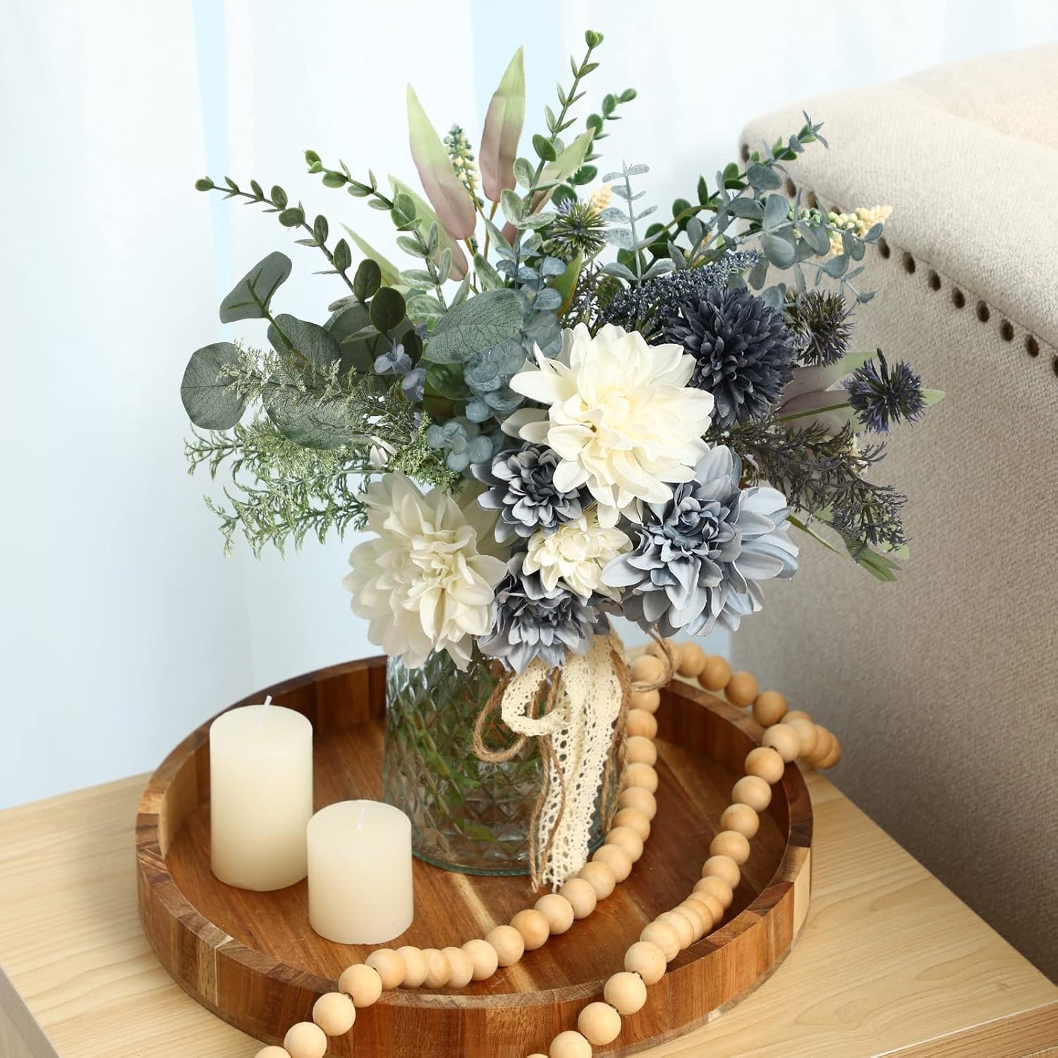 Quality: Fake flowers with vase including white and gray-blue flowers, some fake plants and a glass vase decorated with twine. Fake plants and flowers can be bent or cut according to the effect you want