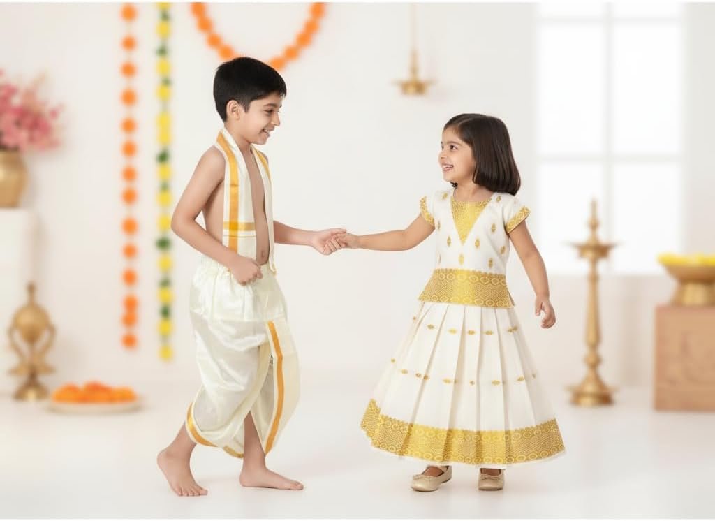 Experience the charm of authentic South Indian tradition with this beautifully coordinated Mundu Angavastram and Matching Pattu Pavadai Set. Designed in rich traditional patterns, this set brings together the elegance of a classic Mundu and the royal feel of a Pattu Pavadai, making it perfect for festivals, temple visits, weddings, and cultural celebrations.