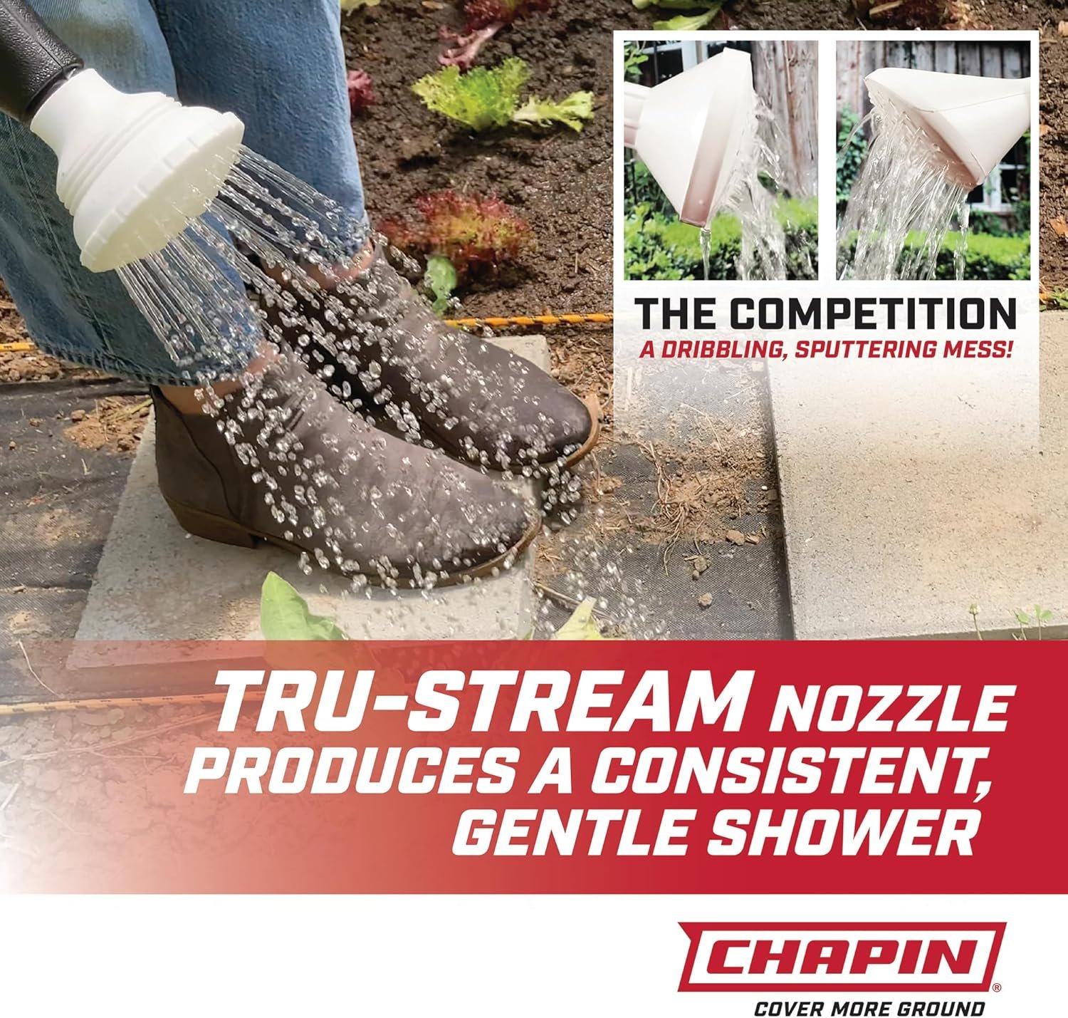TRU-STREAM TECHNOLOGY: precision-flow shower nozzle let’s water flow evenly, not dribbling or gushing waterfalls on your hanging plants and gardens