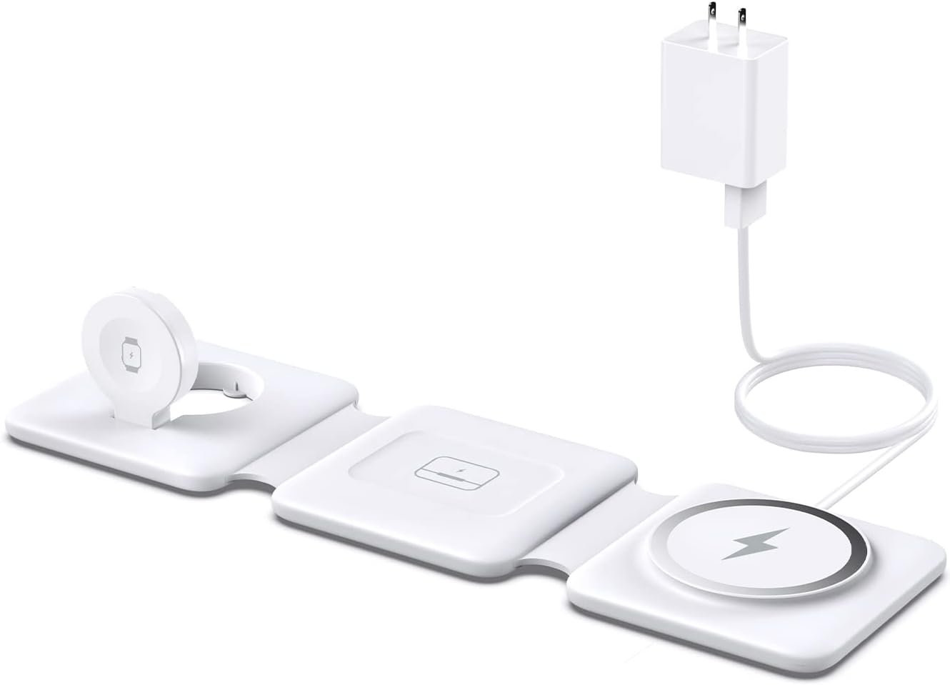 3 in one Fold Up Charger Station: The wireless charging pad contains a magnetic suction, which can automatically and accurately charge the iPhone 12 and above series. The magnetic suction is suitable for iPhone 16/16 Plus/16Pro/16 Pro max15/15 Plus/15Pro/15 Pro max/14/14 Pro/14 Plus/14 Pro Max/13/13 Pro/13 Pro Max/12/12 Pro/12 Pro Max. It is also compatible with Apple Watch Ultra 10 9 8 7 6 5 4 3 2 & AirPods(Note: only support AirPods 2/3/4 with magnetic devices).