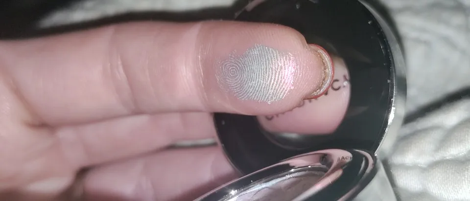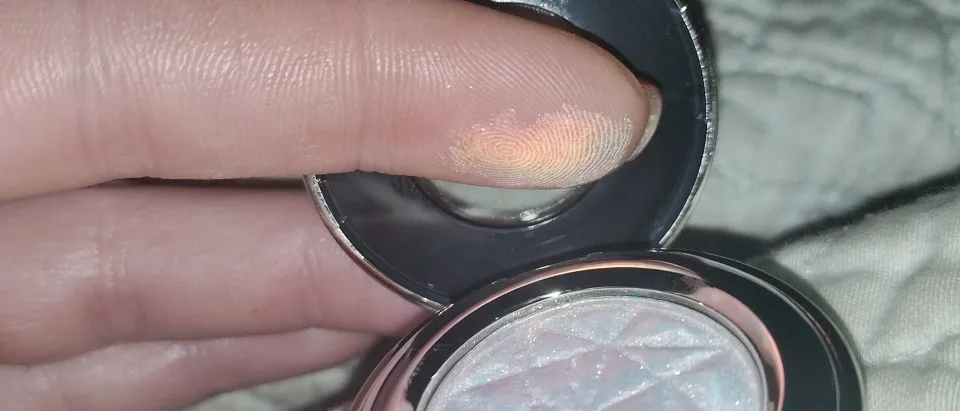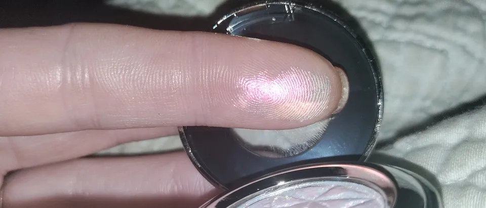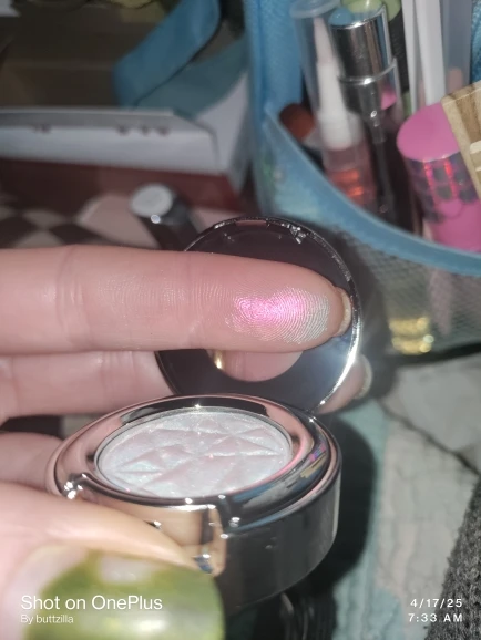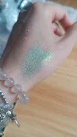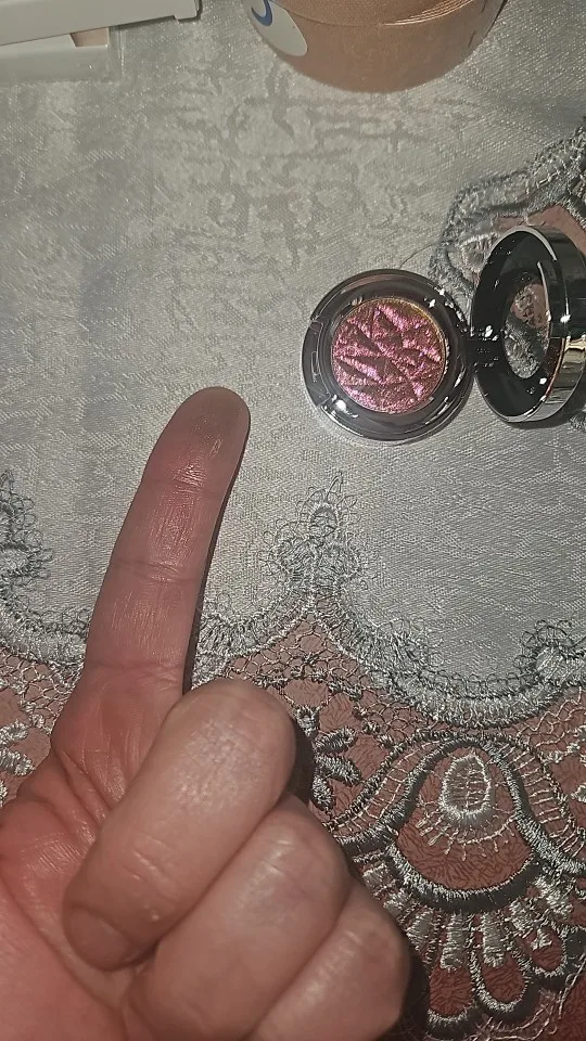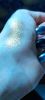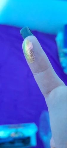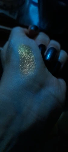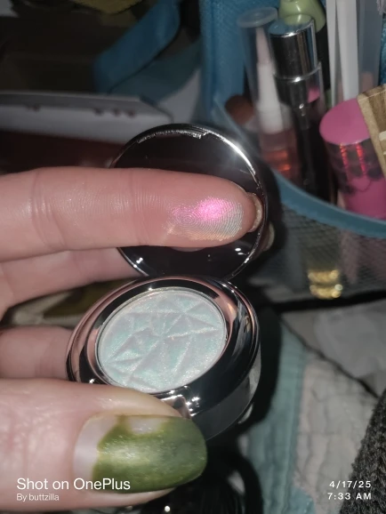 A very pretty eyeshadow, like the rest of the shades. It has a base that is almost transparent with a greenish-gray color and pink glitter, which depending on the angle of light, changes to gold, orange, green, and purple. It’s difficult to capture the nuances with the camera.