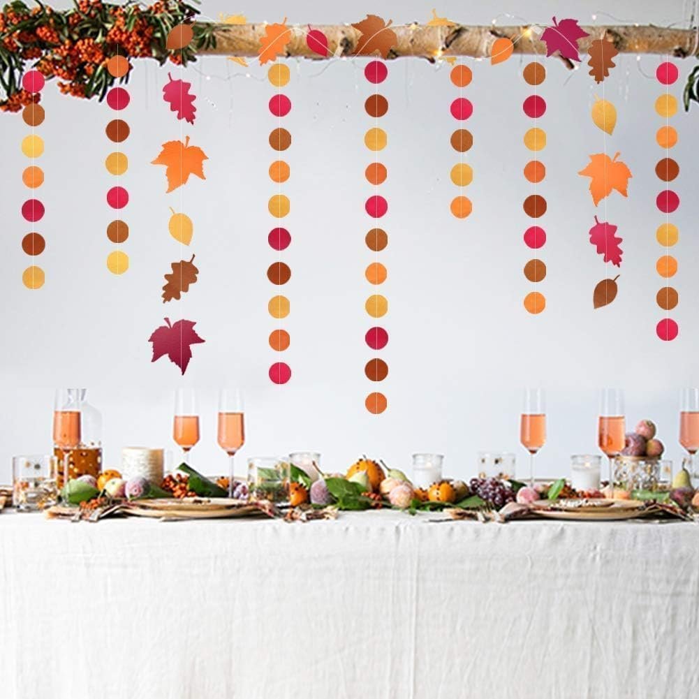 Package:This autumn garland set includes 2 strings of 13ft maple leaf garlands featuring oversized 6-inch leaves and 2 strings of 13ft dot circle garlands with 2-inch diameter accents. With 52 feet of total length, this versatile decoration set creates stunning visual displays for any fall themed event. The natural maple leaf design paired with playful polka dots offers the perfect balance of rustic charm and festive elegance.