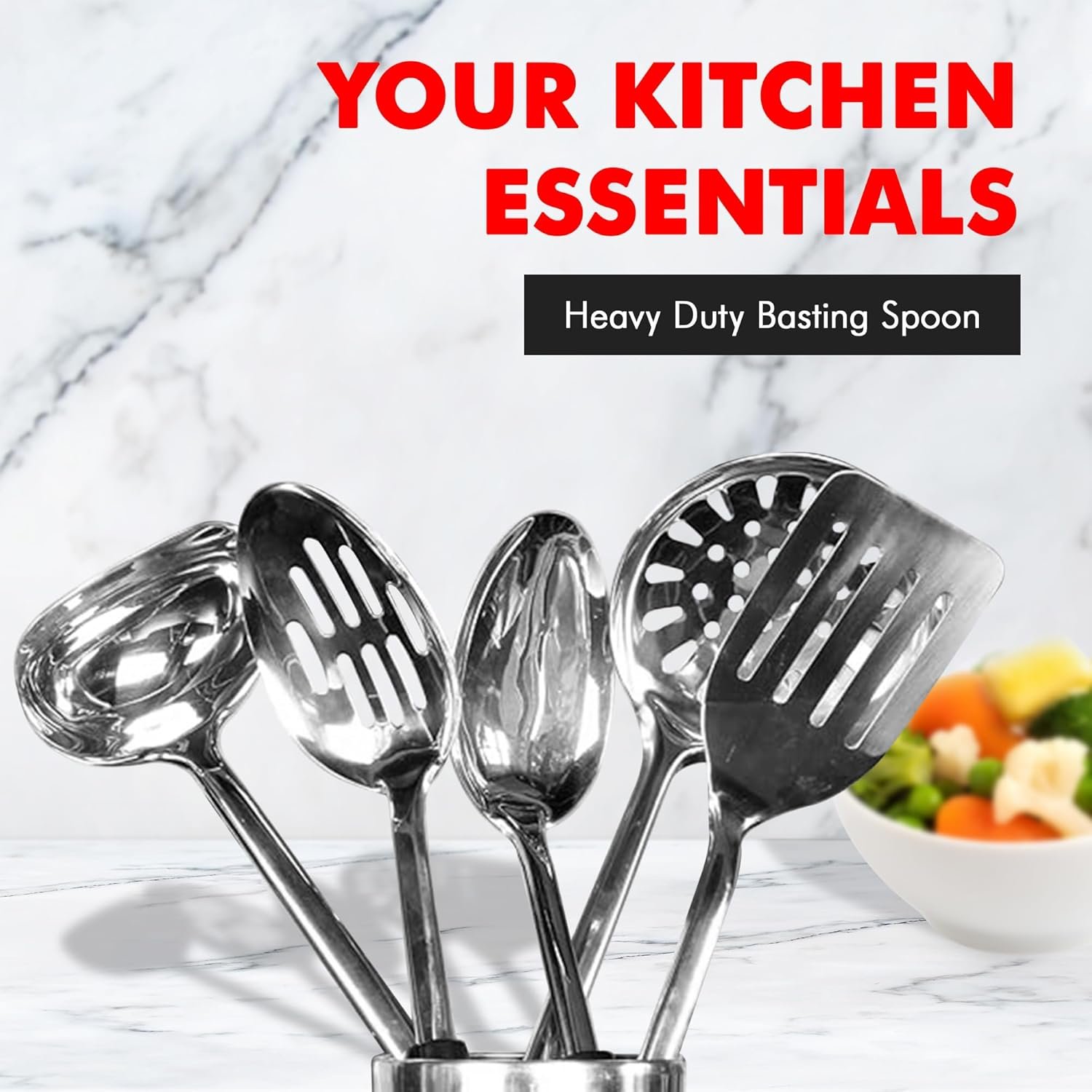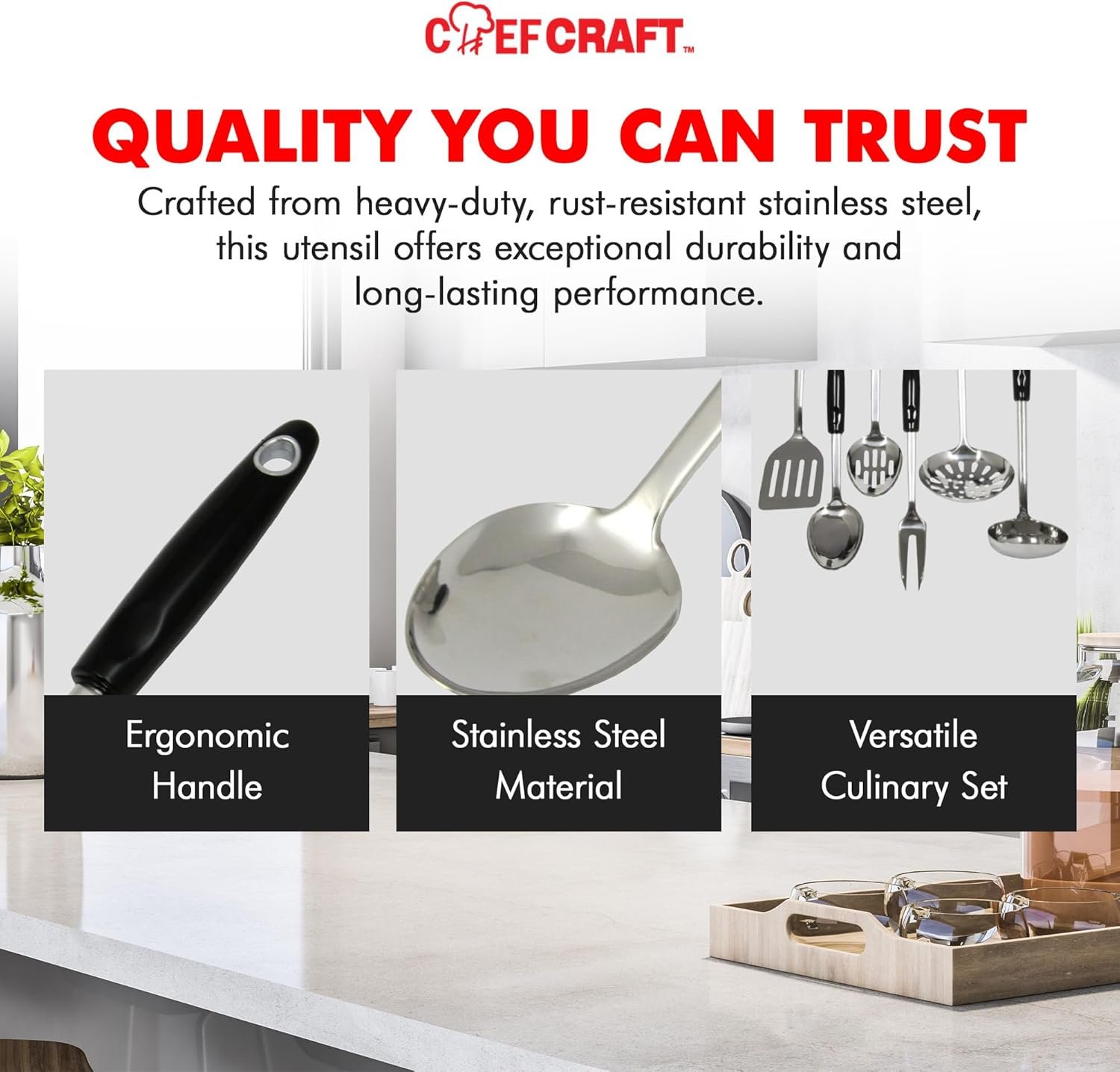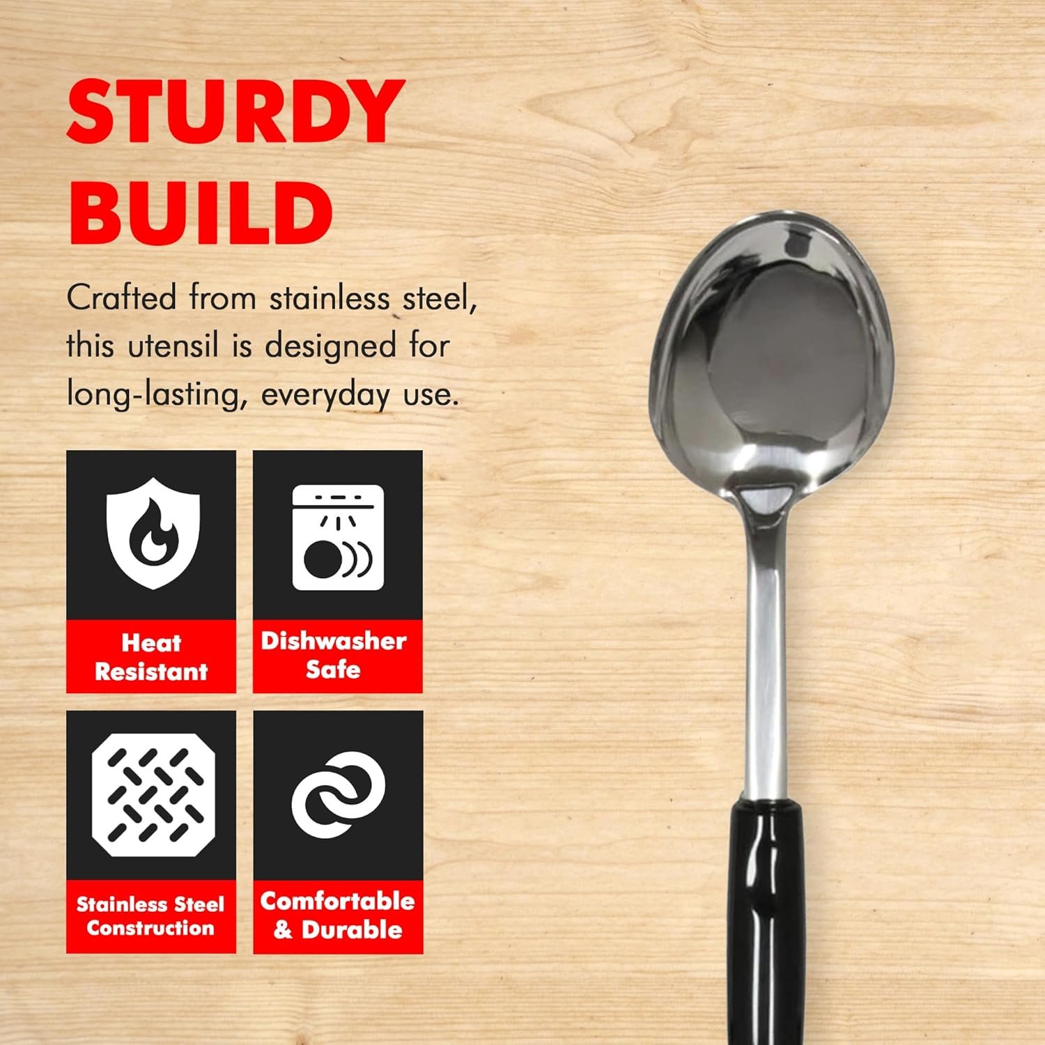 The Chef Craft Heavy Duty Select Stainless Steel Spoon is very durable along with being dishwasher safe. The stainless steel construction is resistant to rust. It is constructed of a single sheet of stainless steel to lend durability while the ergonomic plastic handle is comfortable to use. The 12 Inch length provides enough distance from the pan to prevent getting burnt while also enough control stir or baste foods easily.