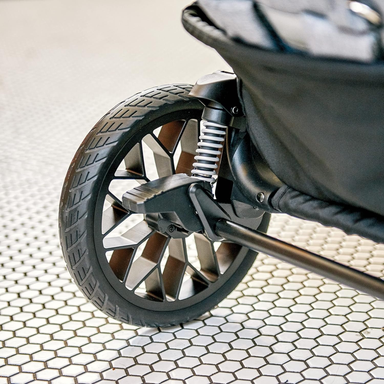 Bumpy city sidewalks and uneven terrain pose no problem for the Corso LE Stroller thanks to features such as FlexCore adjustable rear suspension and large wheels with foam-filled, treaded rubber tires.