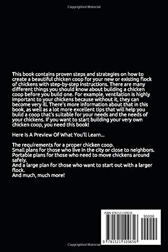 Learn how to build your own chicken coop using these step-by-step plans today! This book contains proven steps and strategies on how to create a beautiful chicken coop for your new or existing flock of chickens with step-by-step instructions. There are many different things you should know about building a chicken coop before you build one. For example, ventilation is highly important to your chickens because without it, they can become very ill. There’s more information about that in this book, as well as a lot more excellent tips that will help you build a coop that’s suitable for your needs and the needs of your chickens. If you want to start building your very own chicken coop, you need this book!Here Is A Preview Of What You’ll Learn…The requirements for a proper chicken coop.Small plans for those who live in the city or close to neighbors.Portable plans for those who need to move chickens around safely.And a large plan for those who want to start out with a larger flock.And much, much more!Download your copy today! Take action now and download this book!