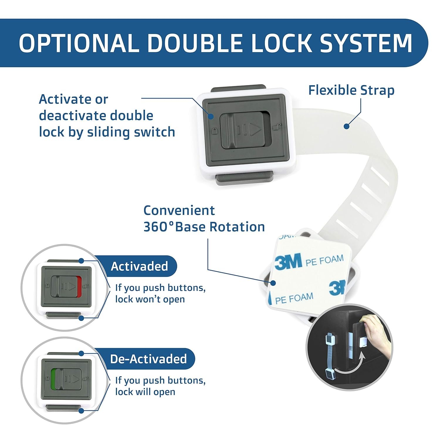 ADVANCED DOUBLE LOCK makes it so toddlers can’t push the button and open. Slide switch to double lock. When child pushes the button, the lock won’t open. This double lock is an optional feature you can use when needed. This lets you use these locks for the first few years of your child’s development.