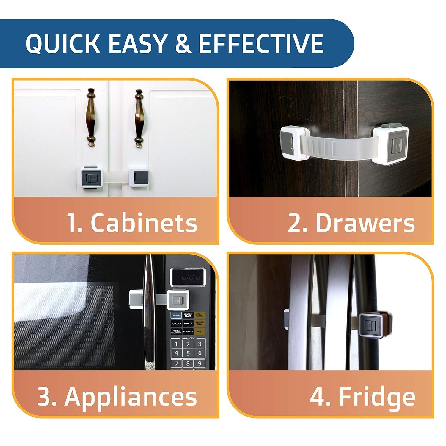 EASY LENGTH ADJUSTMENT makes these perfect for any application securing drawers, doors, oven, refrigerator, toilet and more. Adjust from 4.5″ to a long 7.5″ to accommodate all sizes of drawers and appliances. This new improved model is your first choice for baby proofing your home, garage, and business.