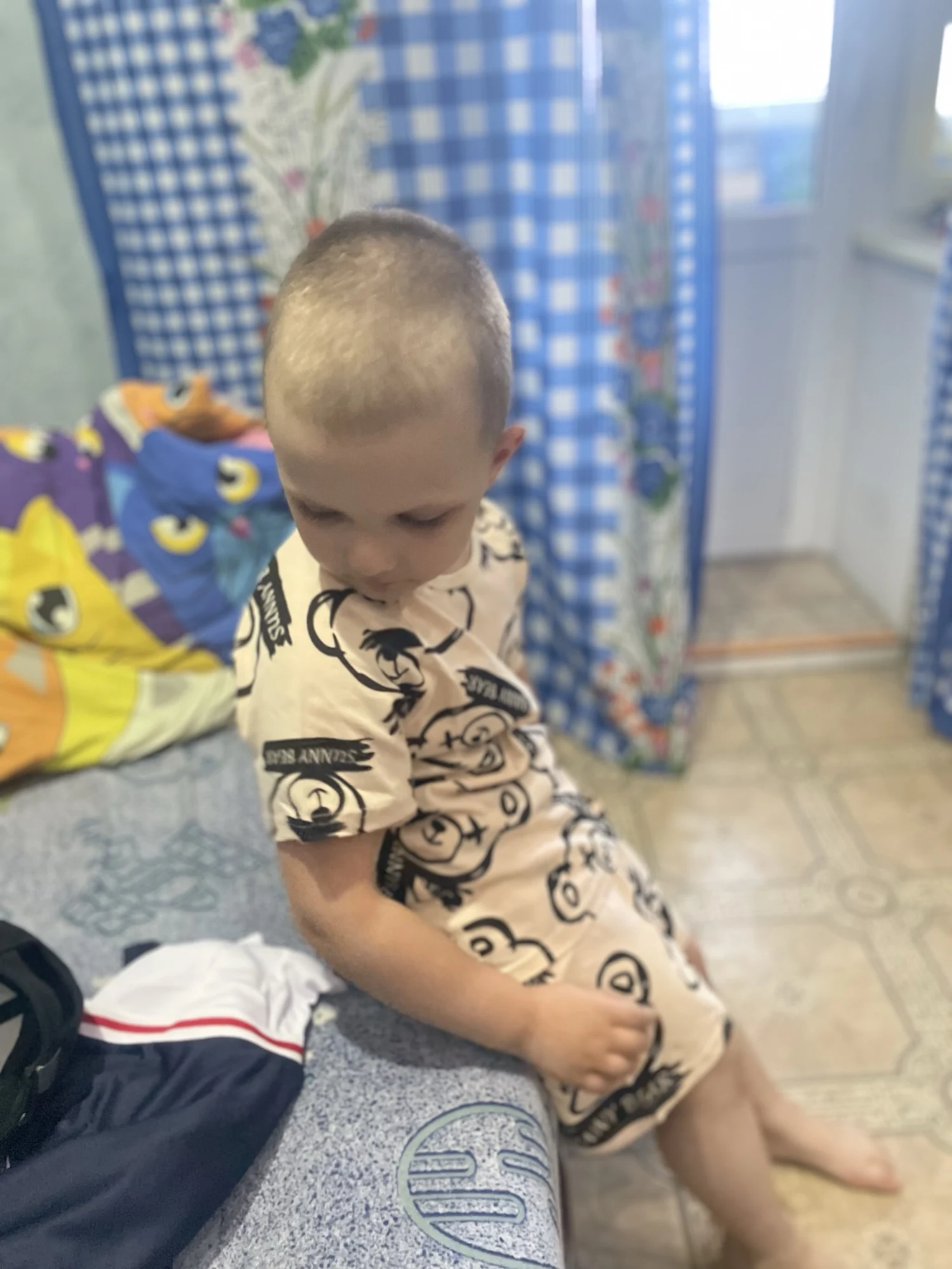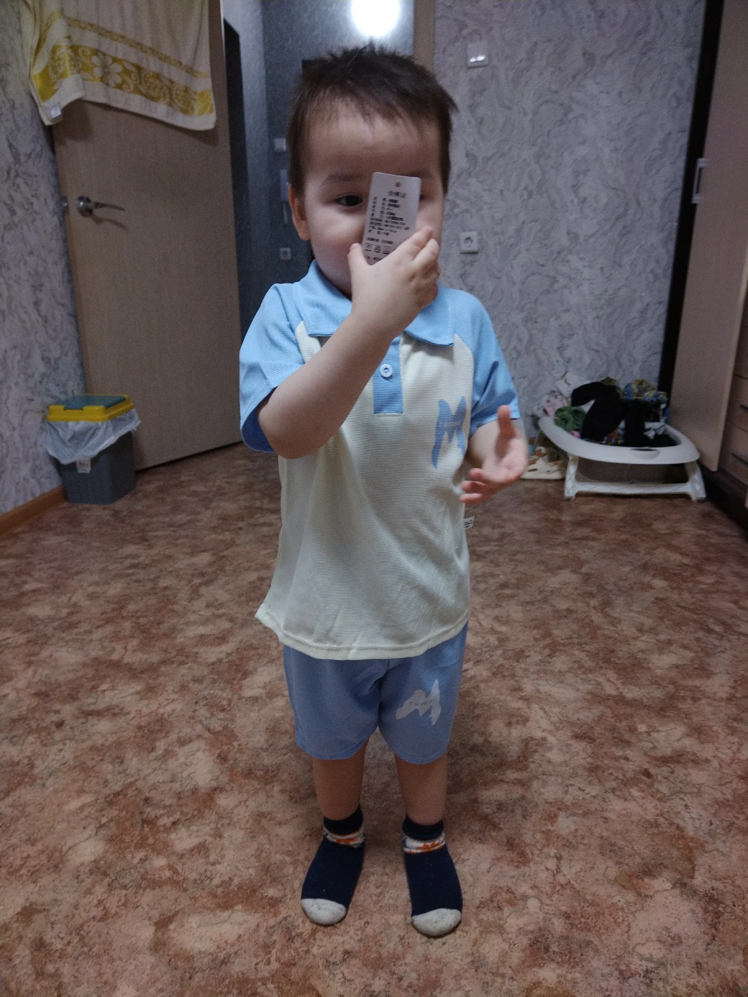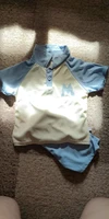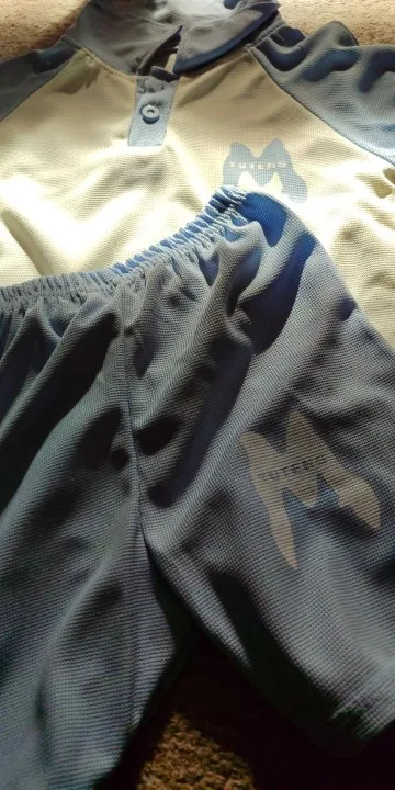 Nice suit, color as in the photo, light fabric, a few stitches are not sewn well, but it doesn’t stand out much, size 90 fits a child 2.4 meters tall with a height of 92 cm.