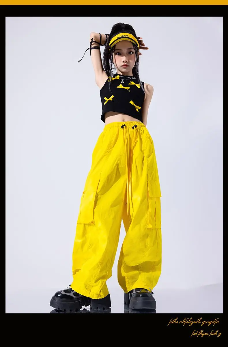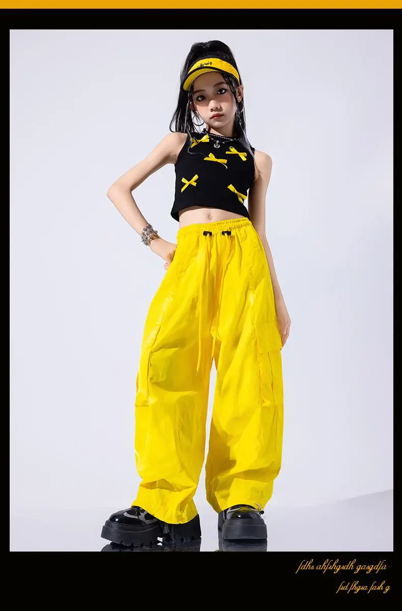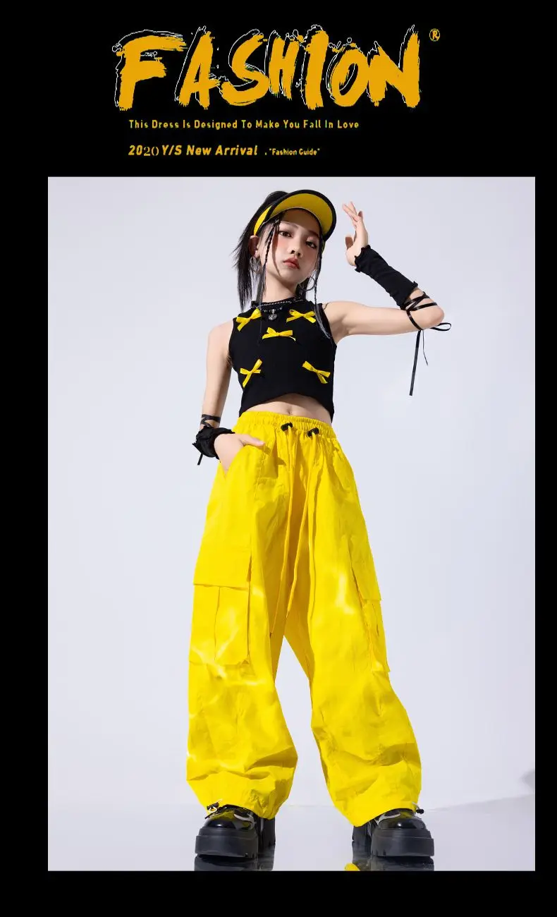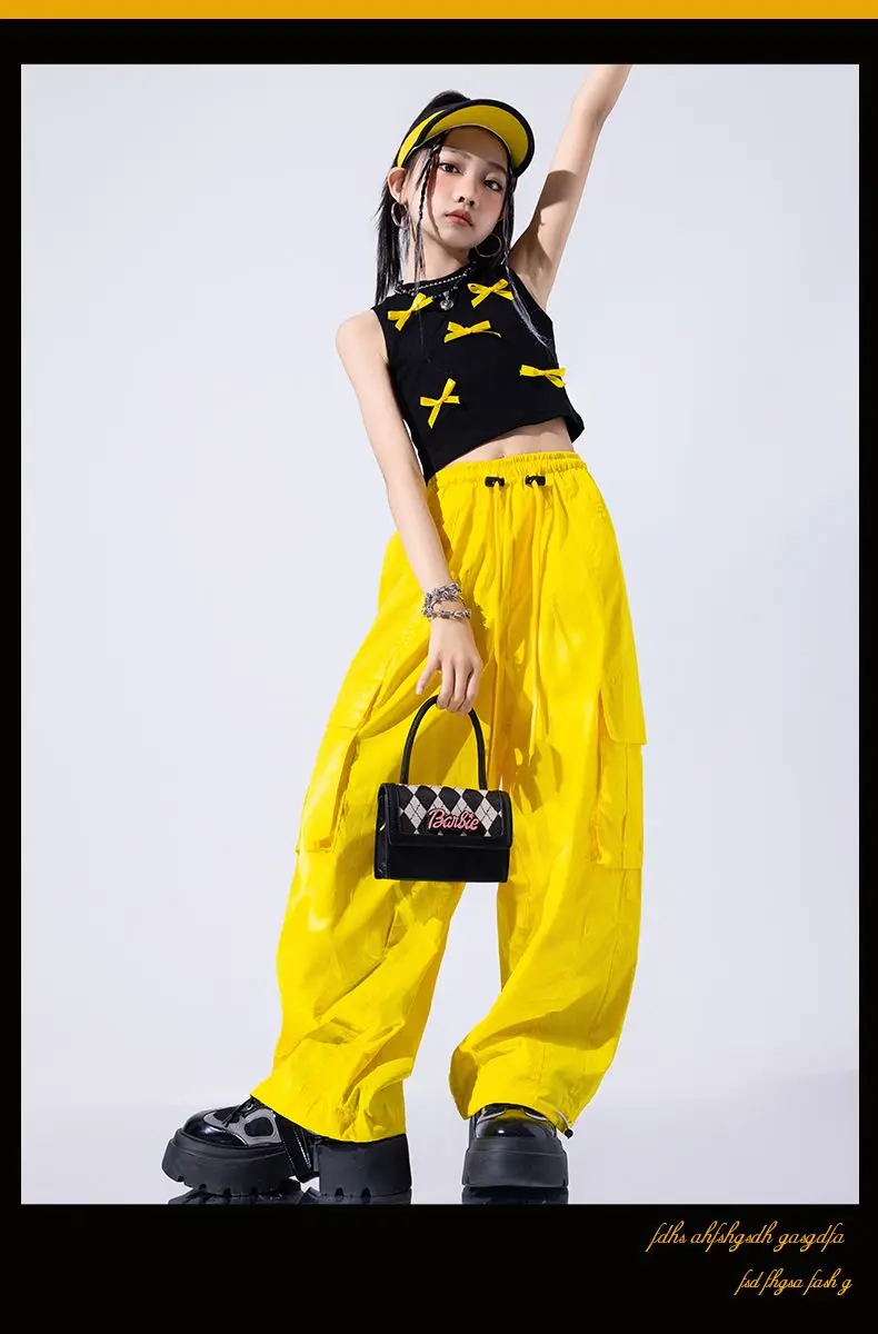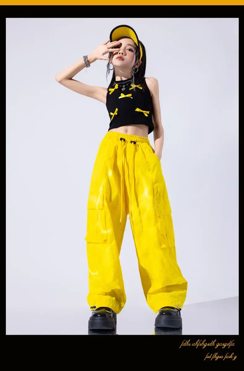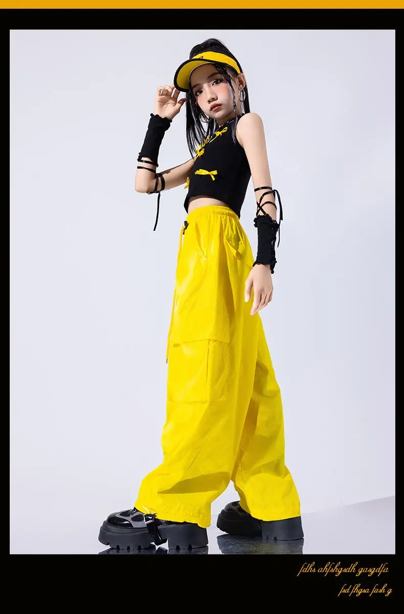 Children Jazz Modern Dance Costumes For Girls Black Vest Yellow Cargo Pants Drum Sets Kids Hip Hop Dance Stage Clothes